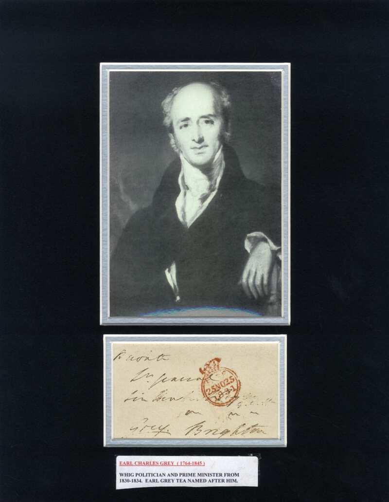 Autograph subscription signed, two page (both sides) - with stamps, 4,75 x 3 inch, Brighton, 27.07.1832*, written and signed in dark ink "Grey", affixed (verso with tape) with a photograph of Charles Grey, 2nd Earl Grey in a mount (altogether 11 x 14 inch), with signs of age wear - in fine to very fine condition.