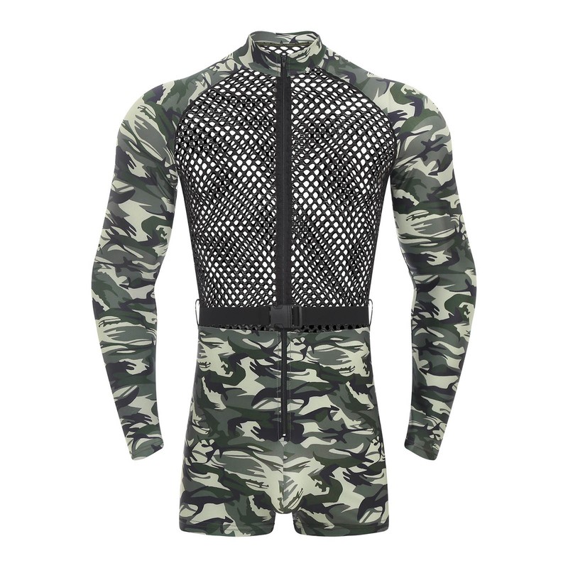 The camouflage pattern on the bodysuit is a popular and fashionable element, bringing a sense of military-style charm and a modern aesthetic.