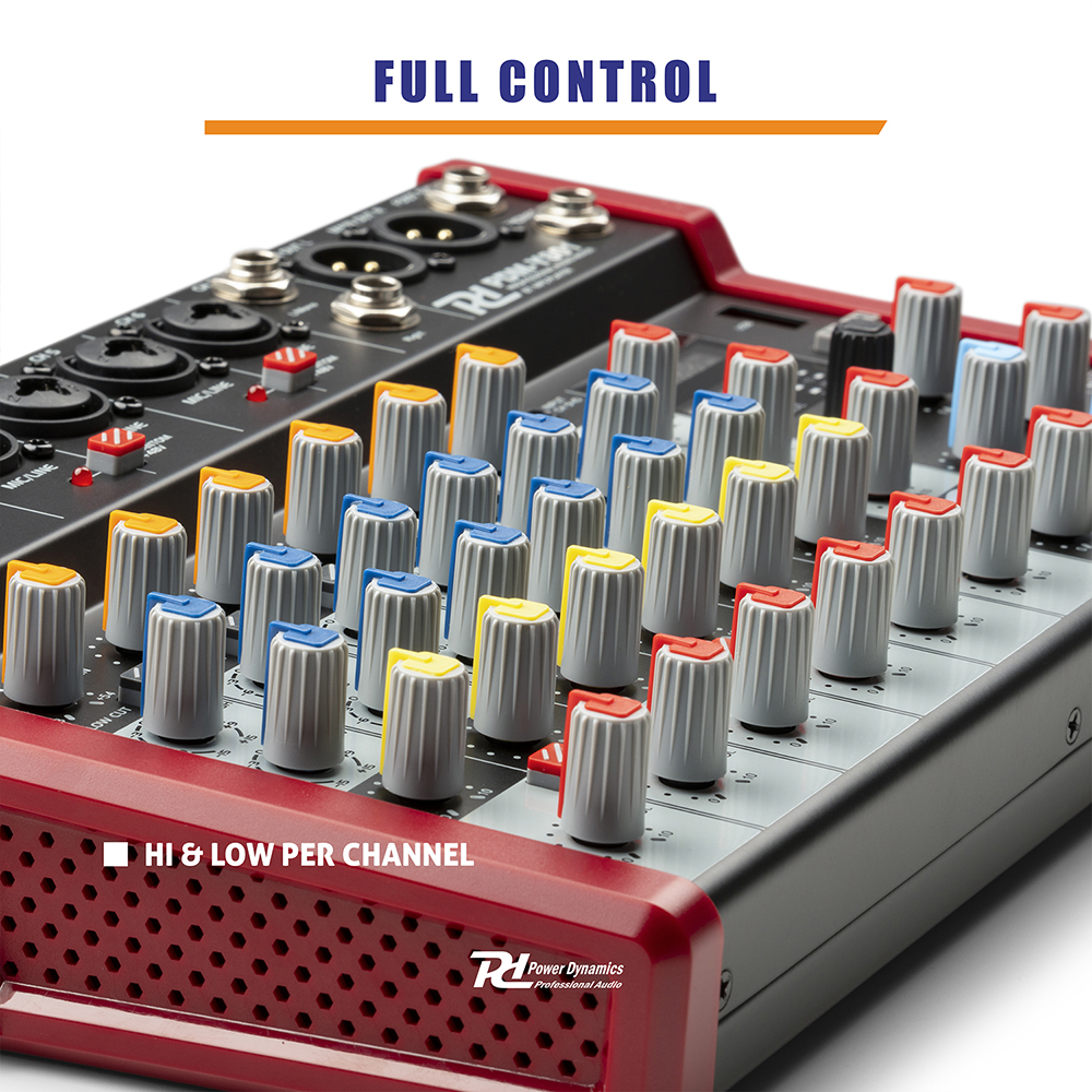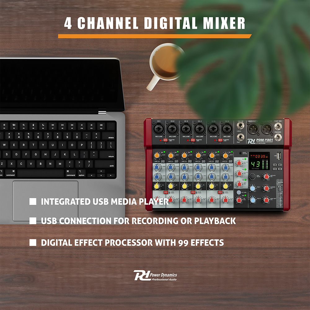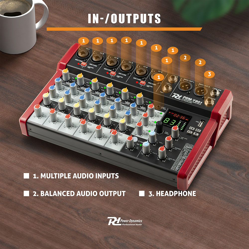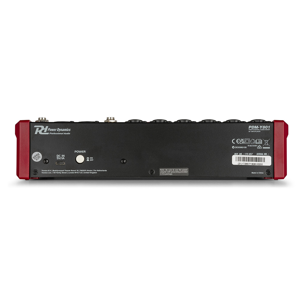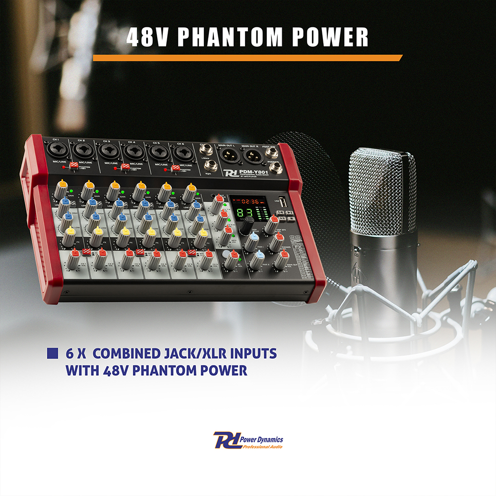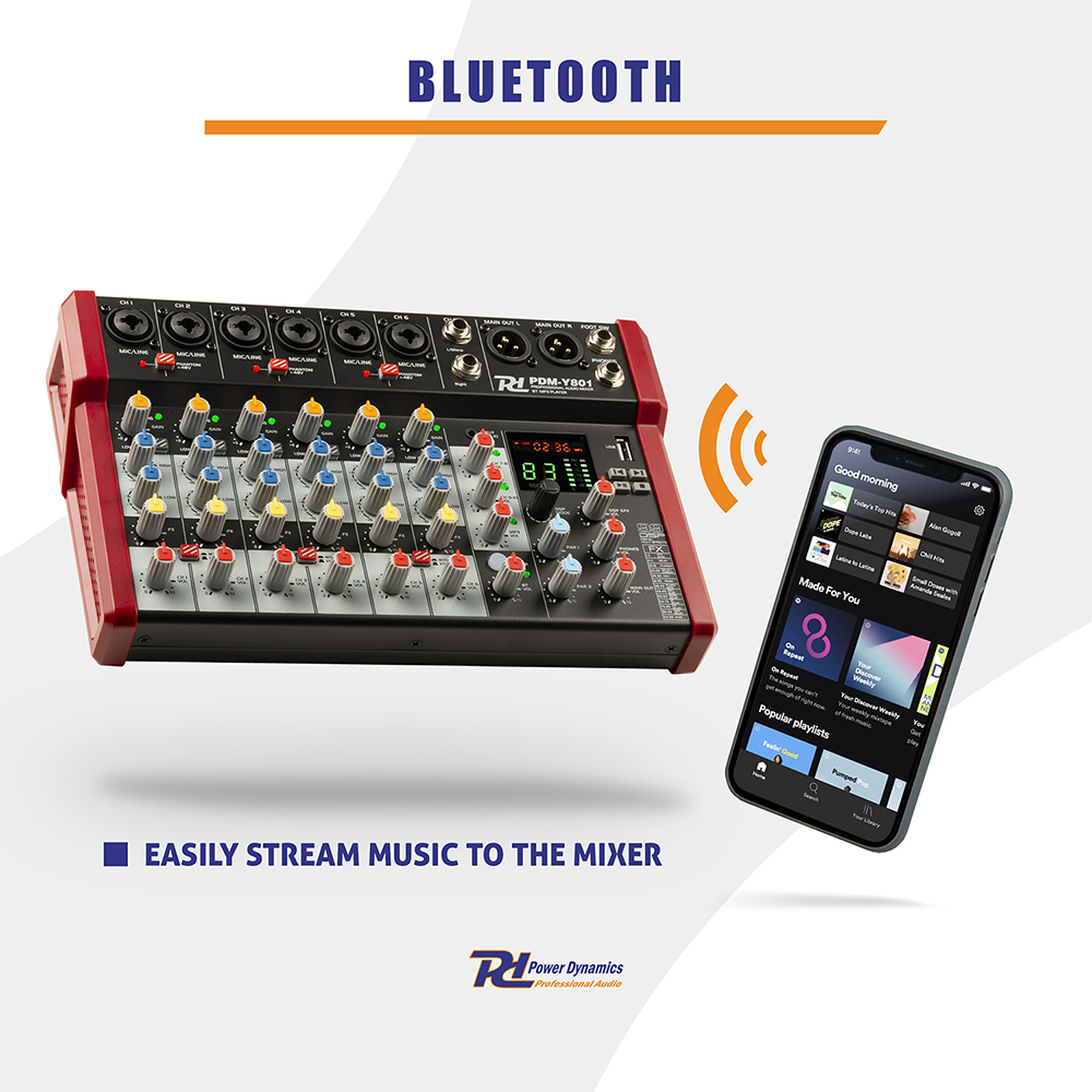 The Power Dynamics PDM-Y801 8-channel PA mixer is ideal for both live events and recording purposes. It includes various connectivity options and controls to enhance the sound. It also features a digital effects module, an MP3 player, and Bluetooth. This music mixer comes with six mic/line channels, offering XLR/Jack inputs for versatility. Each of these channels has its own volume, gain, and high and low controls. There is also a 48V phantom power switch for use with condenser microphones. A USB port facilitates MP3 playback directly from a USB drive or connection to a PC, ideal for recording purposes. The mixer is also Bluetooth-enabled for wireless streaming from devices like smartphones or tablets. Stereo-balanced XLR outputs make it easy to connect the mixer to most PA systems and there is a headphone output for monitoring. In addition, a 24-bit, 48KHz digital effects processor with 99 effects enables the sound to be refined. Overall, the Power Dynamics PDM-Y801 microphone mixer is a versatile device ideal for enhancing live and recorded audio. With its varied inputs and detailed controls, it is a great option for audio enthusiasts seeking to create a professional sound. Key Points
