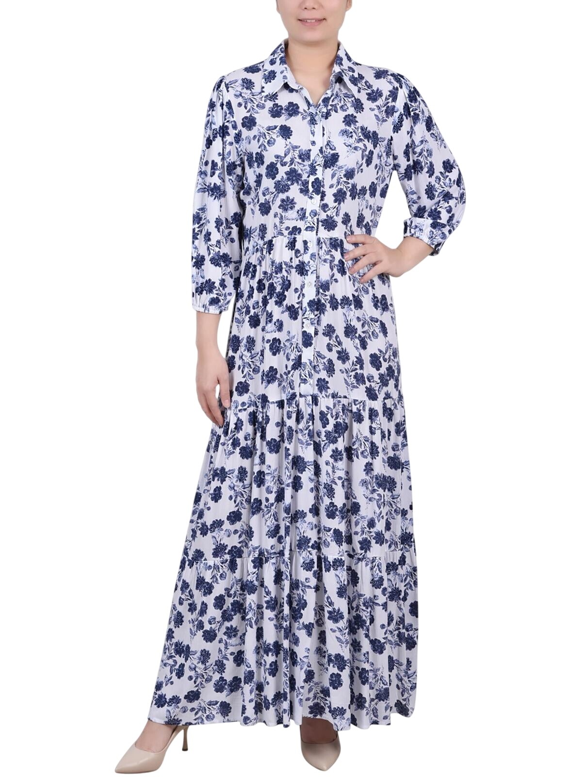 1. Ny Collection Womens Petites Crinkle Tiered Maxi Dress White Navy Floral PXL