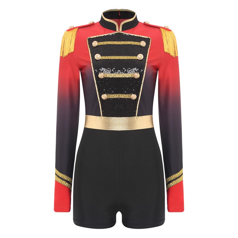 Epaulets on the long sleeves give the jumpsuit a bold and authoritative appearance, drawing inspiration from traditional military and circus costumes.