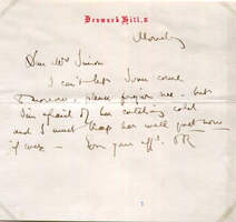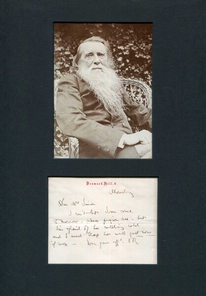 Autograph letter signed (with his initials), one page, 4,5 x 4 inch, `Denmark Hill, S.` stationery, "Monday" (no year), brief letter to "Mr. Simon" - concerning a meeting, written and signed in dark ink "JR", attractively mounted (removable) with a photograph, shows John Ruskin seated in a chair (altogether 8,25 x 11,75 inch), with mild signs of wear to the edges - in fine to very fine condition.