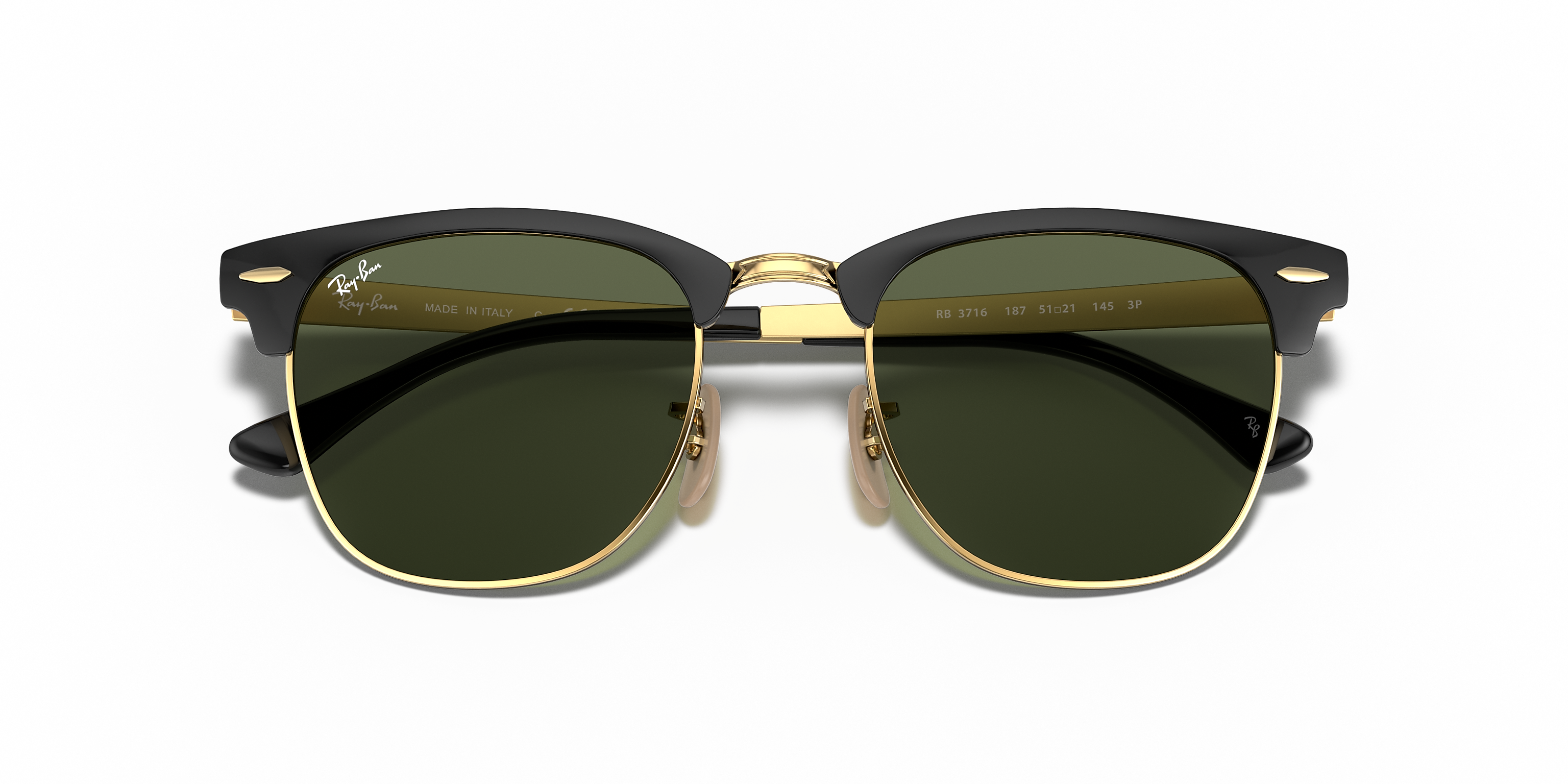 Ray-Ban Clubmaster Metal Sunglasses – Polished Black On Gold Frame with Green Classic G-15 Lenses, 51mm (Model RB3716 187 51-21)