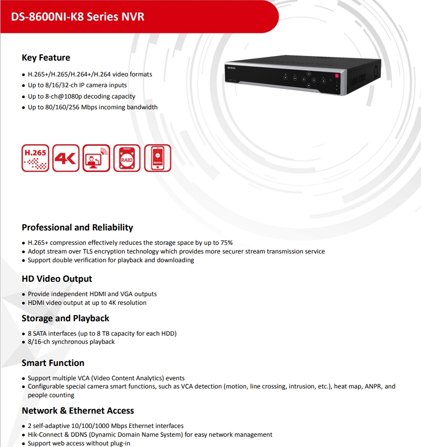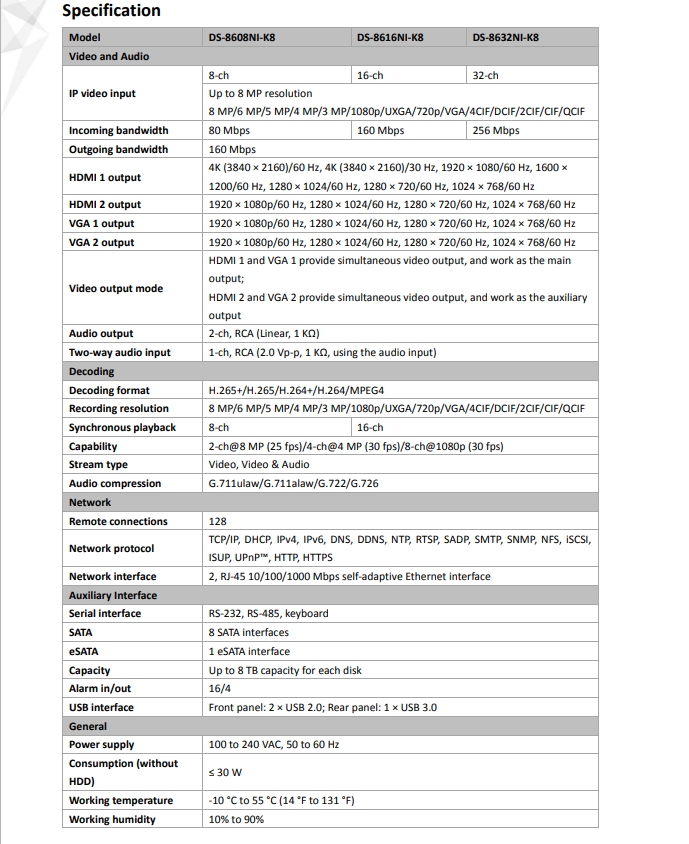 - Decoding Capability2-ch@8 MP (25 fps)/4-ch@4 MP (30 fps)/8-ch@1080p (30 fps)
