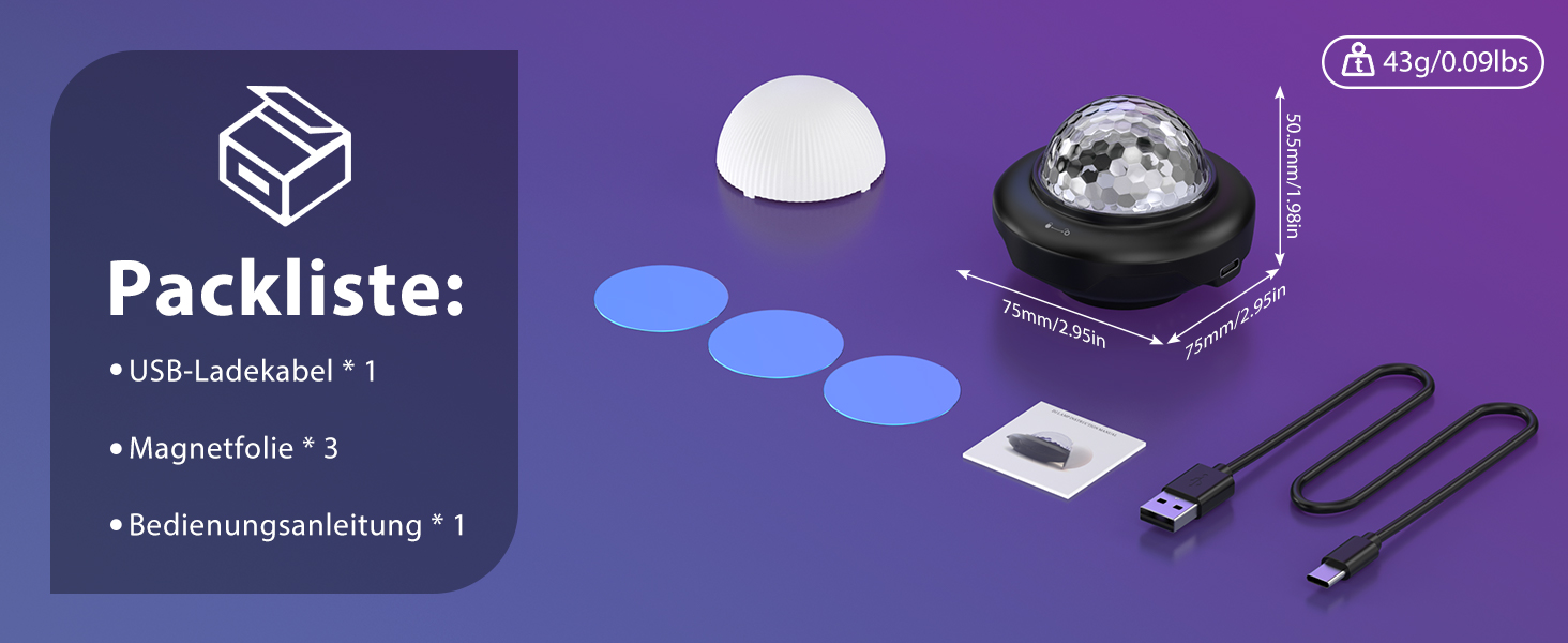 Das Mini Magic Ball Light ist eine Beleuchtungslösung mit verschiedenen Effekten für verschiedene Anlässe. Benutzer können zwischen verschiedenen Beleuchtungsmodi wechseln und das Licht mit einer einzigen Taste ausschalten. Dieses Produkt merkt sich Einstellungen. Zum Ausschalten und Speichern 2 Sekunden gedrückt halten. Beim erneuten Einschalten wird die vorherige Einstellung wiederhergestellt. Sie müssen es nicht erneut anpassen. Die Abdeckung macht dieses Produkt vielseitiger. Die Abdeckung ist ein Nachtlicht. Das Mini Magic Ball Light verfügt über einen 300-mAh-Akku, der bis zu 7 Stunden hält. Aufladen in 1,5 Stunden. Das Licht lässt sich mit einem magnetischen Sockel und einem Klebeblatt einfach installieren. Mit dem Magneten können Sie das Licht an Wänden, Glas, Tischen usw. befestigen. Das Blatt haftet an allem. Dieses Design vereinfacht die Installation und erweitert den Einsatzbereich des Lichts. Das Mini Magic Ball Light eignet sich für KTV, Partys, Schlafzimmer, Autos, Wohnzimmer usw.