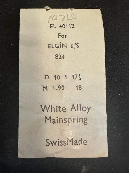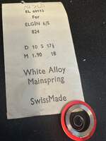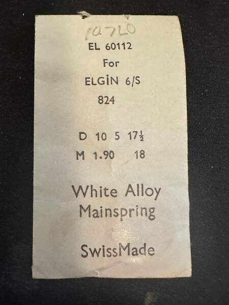 Unmarked Maker Swiss Made Alloy Mainspring EL 60112 for 6s Elgin, Factory No. 824, DB&H end, new in envelope. See images for further details and precise mainspring specifications. I likely have several of these so the one you get may differ slightly from the images. I specialize in hard to find watch parts and all watch parts are unconditionally guaranteed. Images do a pretty good job of representing the item.