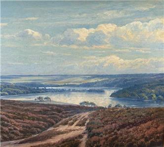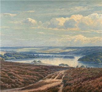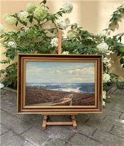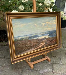 Fine panoramic vista over the Silkeborgsøerne (Silkeborg Lakes) region in Denmark, featuring blooming heather-covered hills and a shimmering, reflective lake in the distance. The oil is set in a classic gold-colored wooden frame