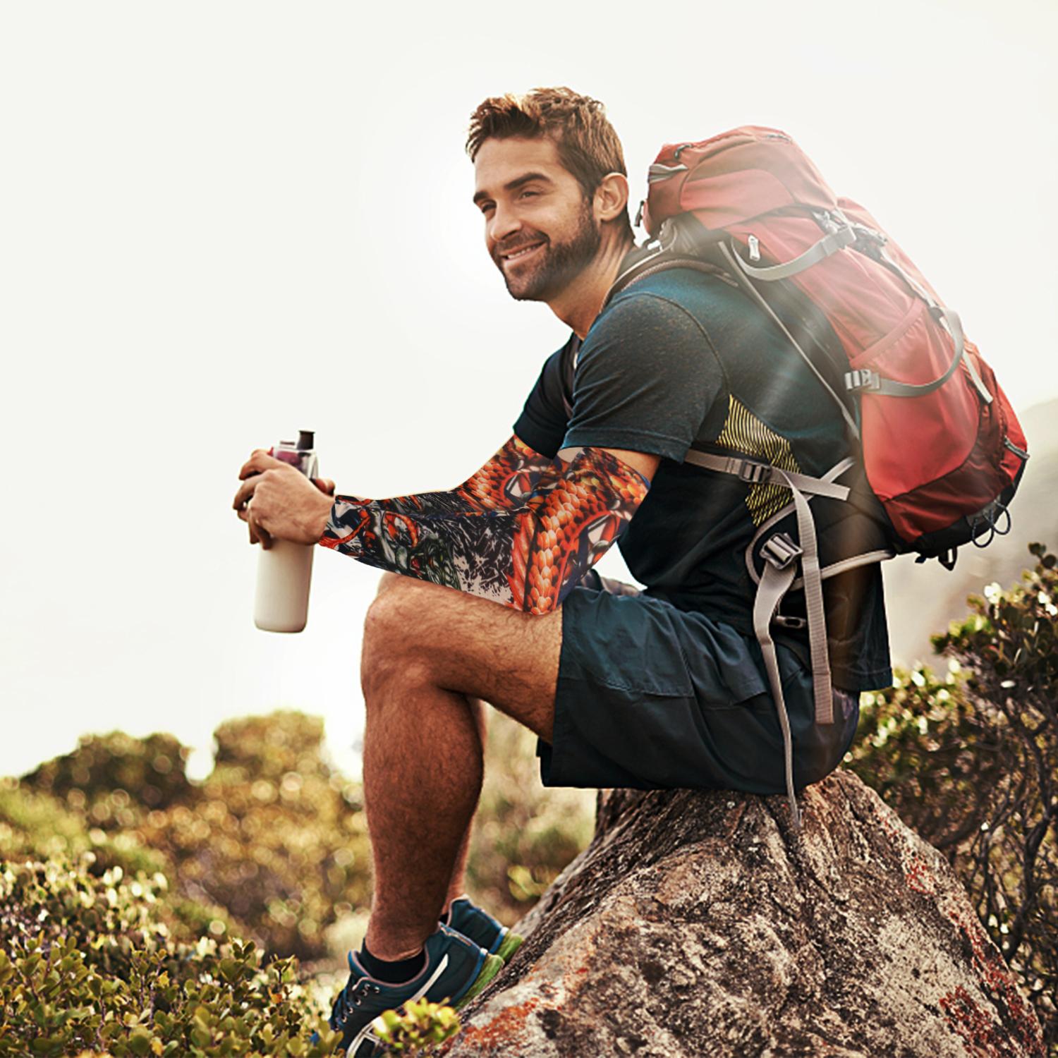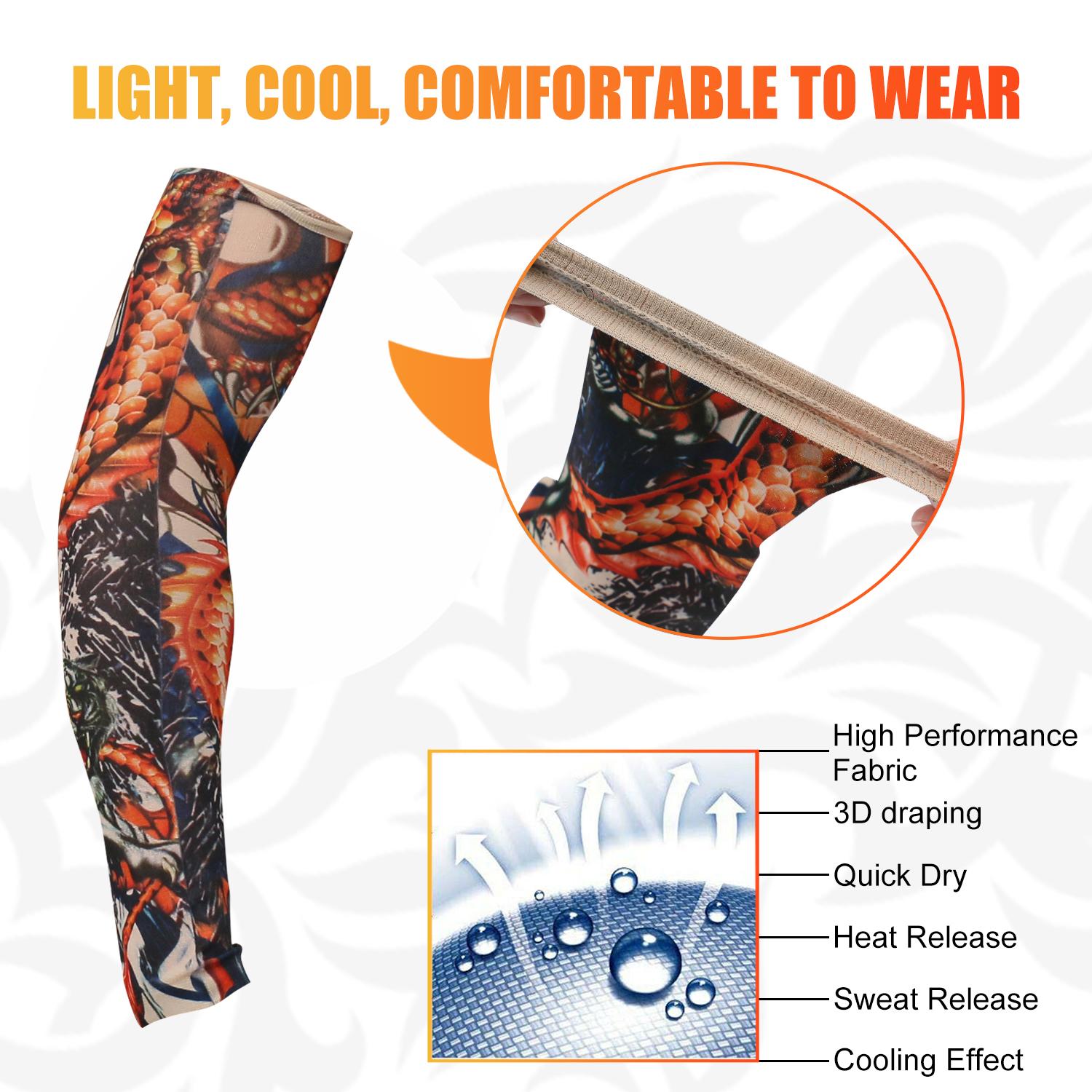 【Sport Arm Cover】- This sport arm sleeve is very flexible and fits your arm perfectly. Don't worry about being too tight or too loose when exercising. Fake tattoos on arm sleeves save you pain and cost. This is a very nice and cheap sports arm cover.