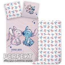 Embarquez pour un voyage magique au pays des rêves avec cette ravissante literie Lilo & Stitch ! Le motif de la housse de couette montre les deux personnages populaires Stitch et Angel se faisant face avec amour, entourés du dicton réconfortant « Tu es magique ». Le dos de l'ensemble impressionne par un motif de petites images de Stitch et Angel dans des tons rouges et bleus, qui apportent de la variété.
