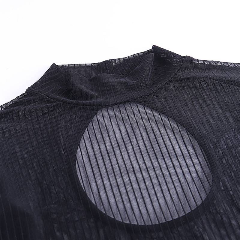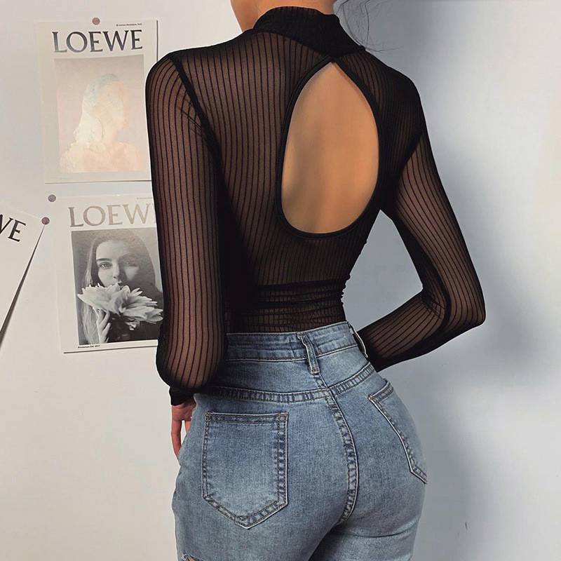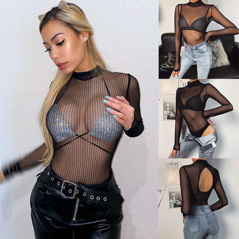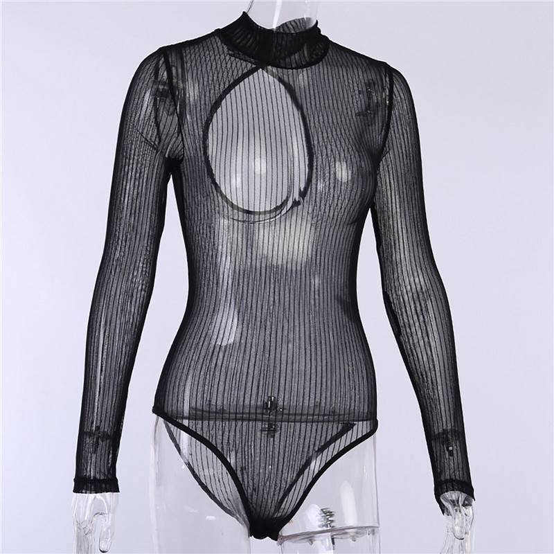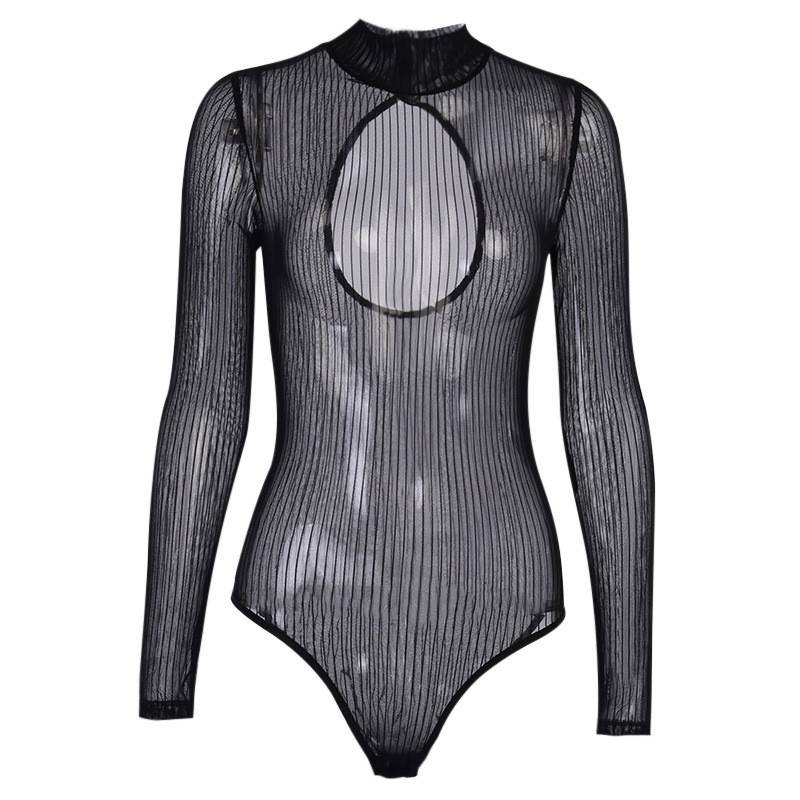 Womens See-through Striped Mesh Bodysuit Mock Neck Long Sleeve Back Keyhole Leotard Clubwear.