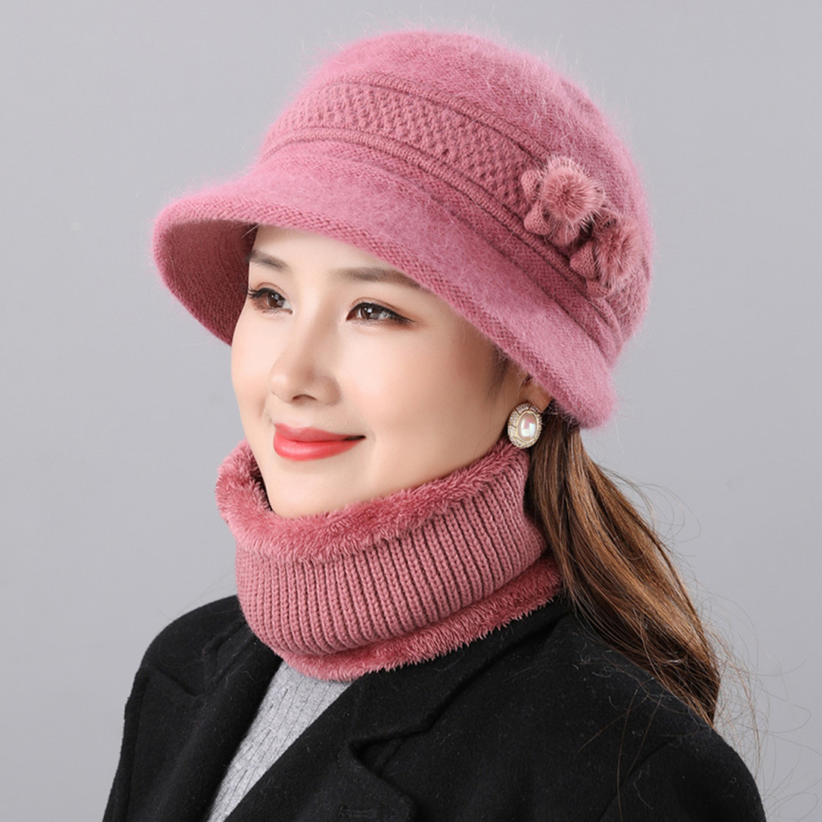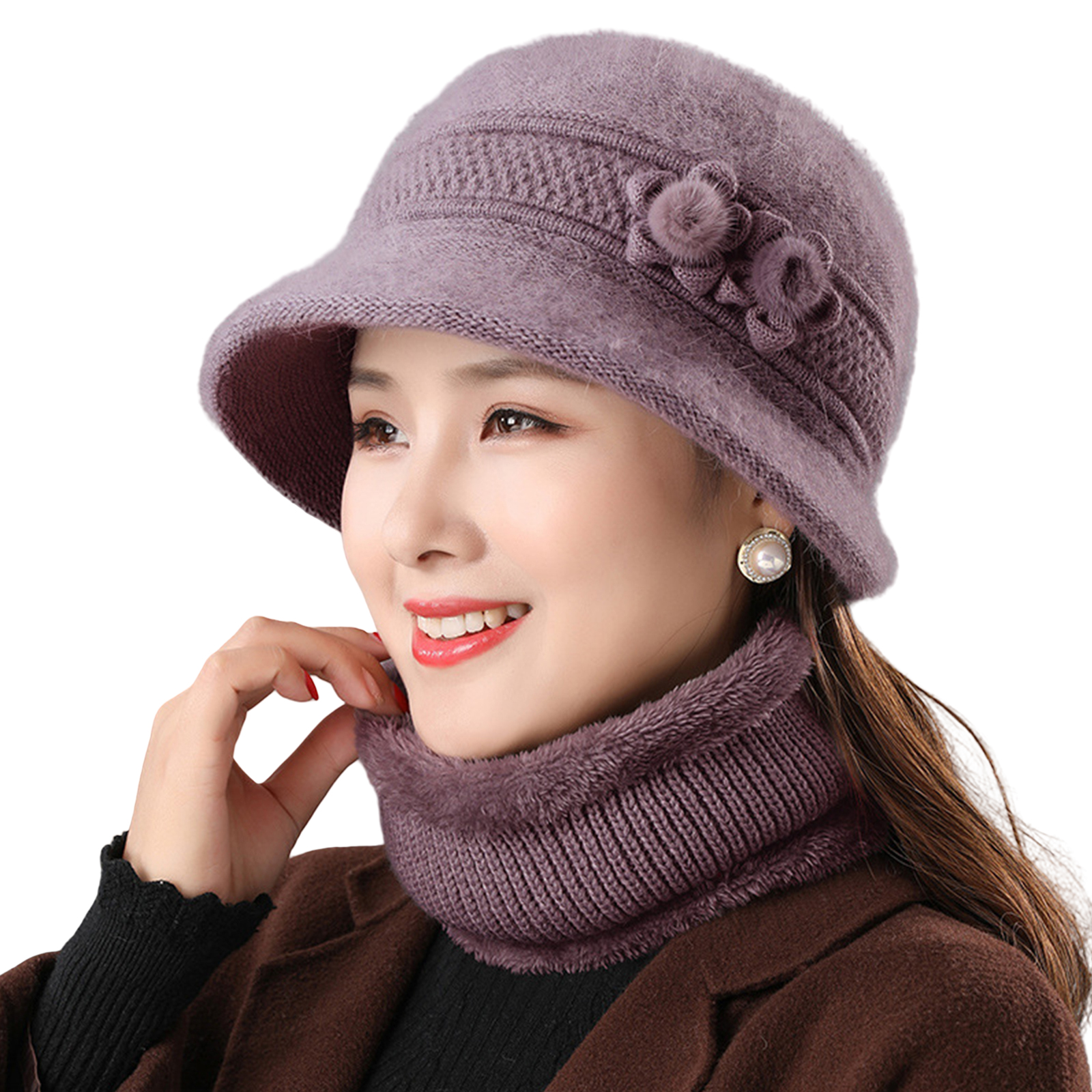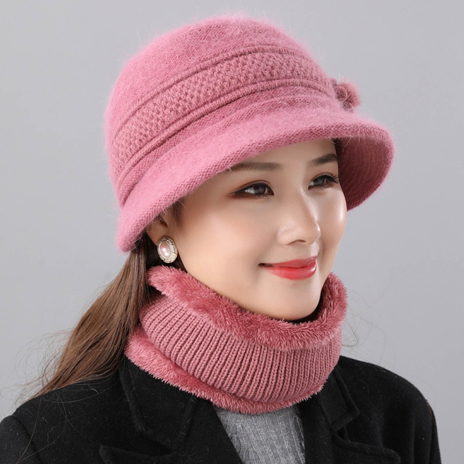 2Pcs Women's Warm Wool Blend Hat Winter Outdoor Windproof Scarf Set Basin Cap