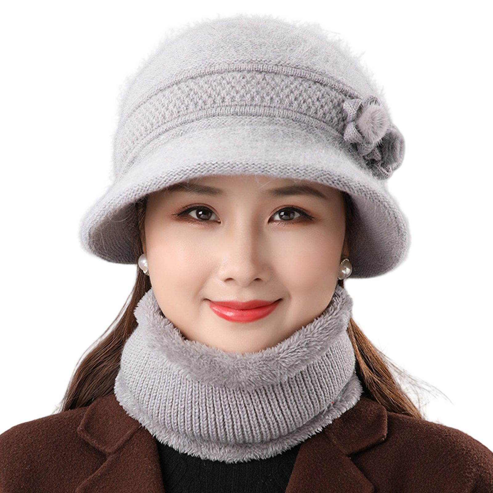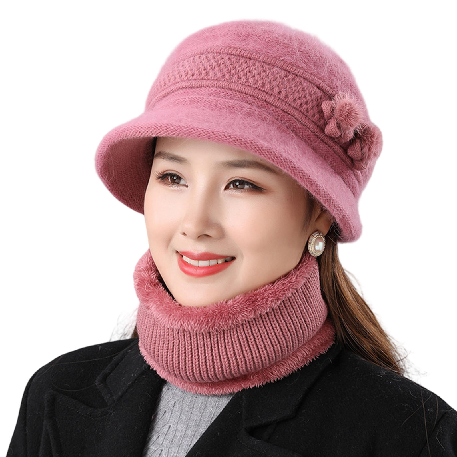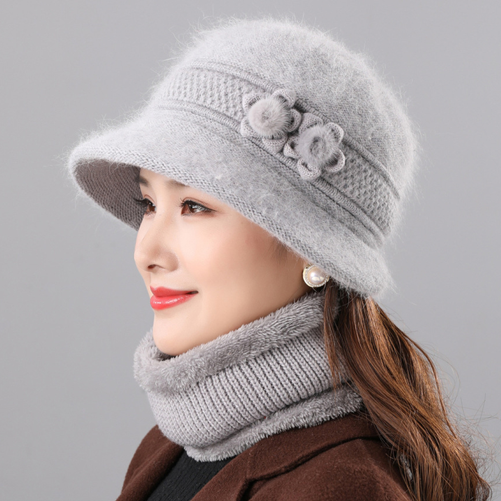 2Pcs Women's Warm Wool Blend Hat Winter Outdoor Windproof Scarf Set Basin Cap