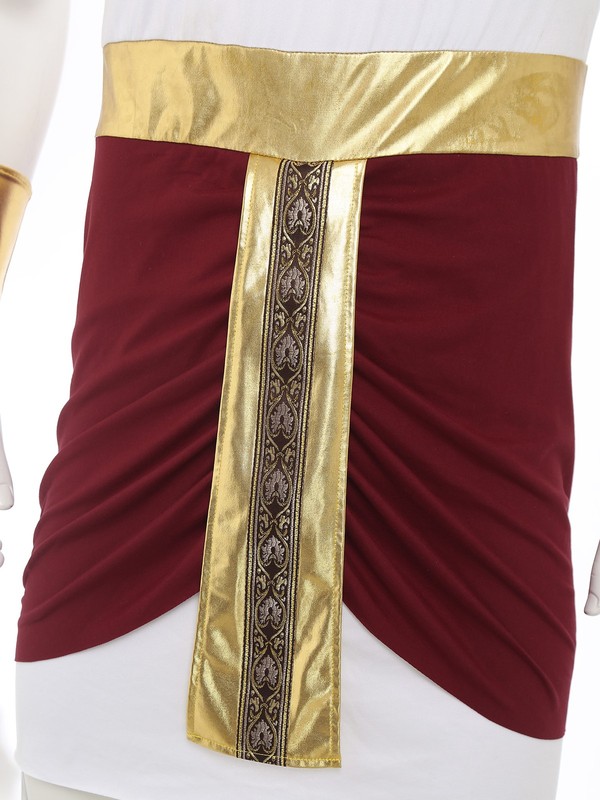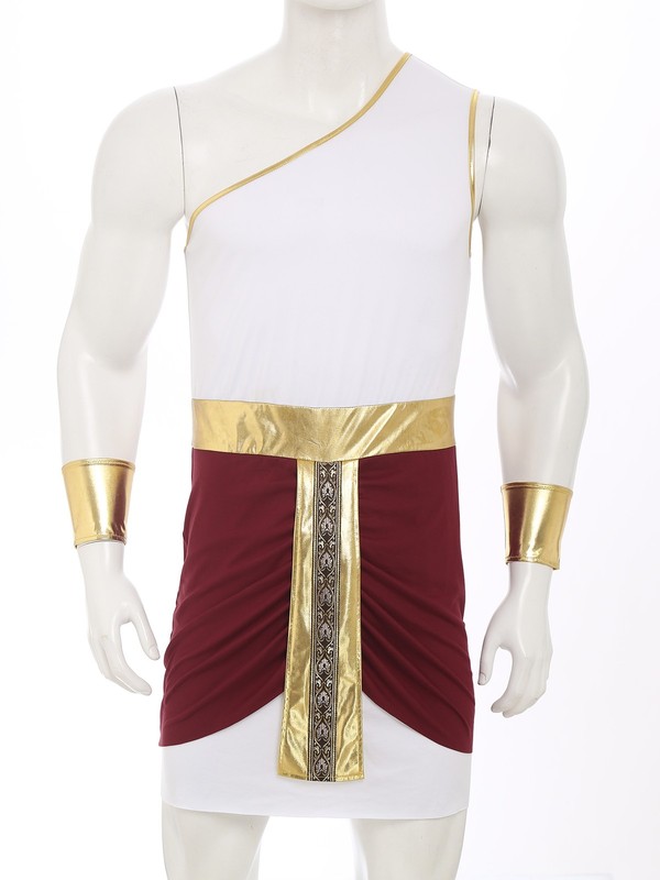The one-shoulder toga and detachable sleeves style is a trendy and unique take on the traditional Egyptian Pharaoh look, reflecting current fashion trends.
