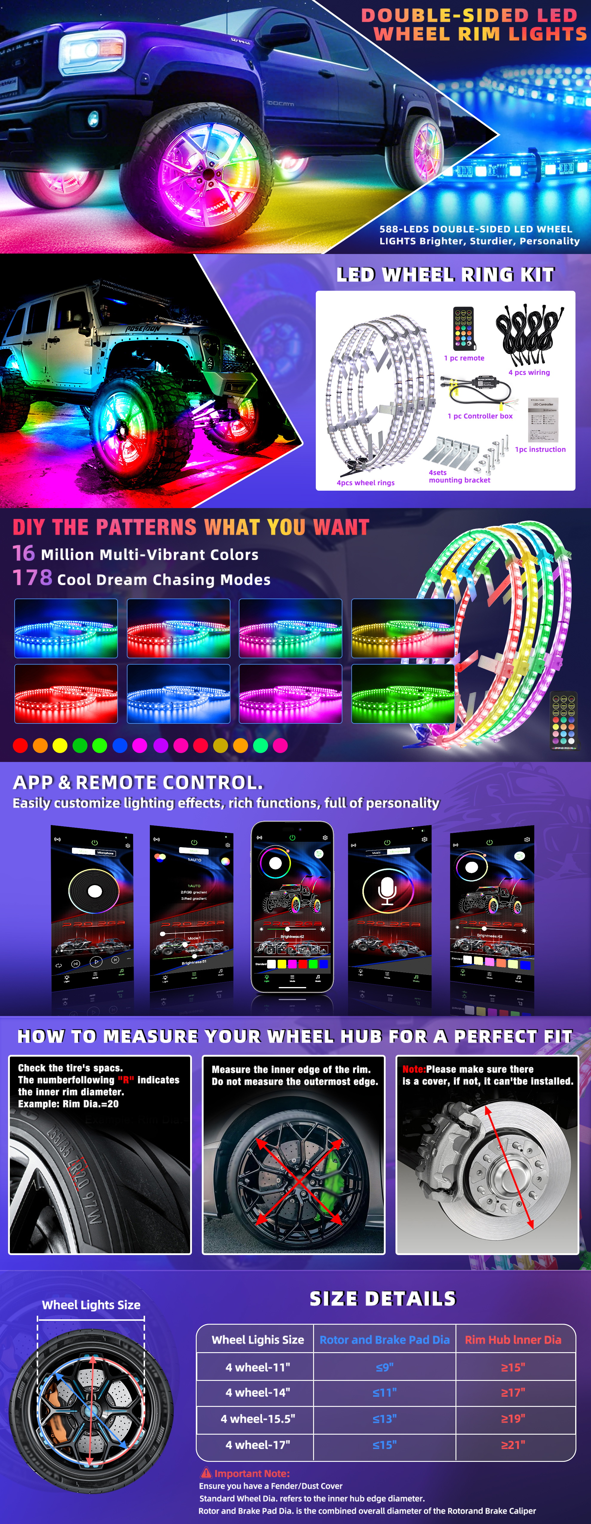Super bright 6500K RGB: The wheel lights for cars are equipped with 5050 RGB double sided single row (312 in the inner row and 324 in the outer row) LED lamp beads, 0.6-inch narrow gap design, full-angle high-brightness coverage, greatly improving the vehicle's recognition and fashion sense.