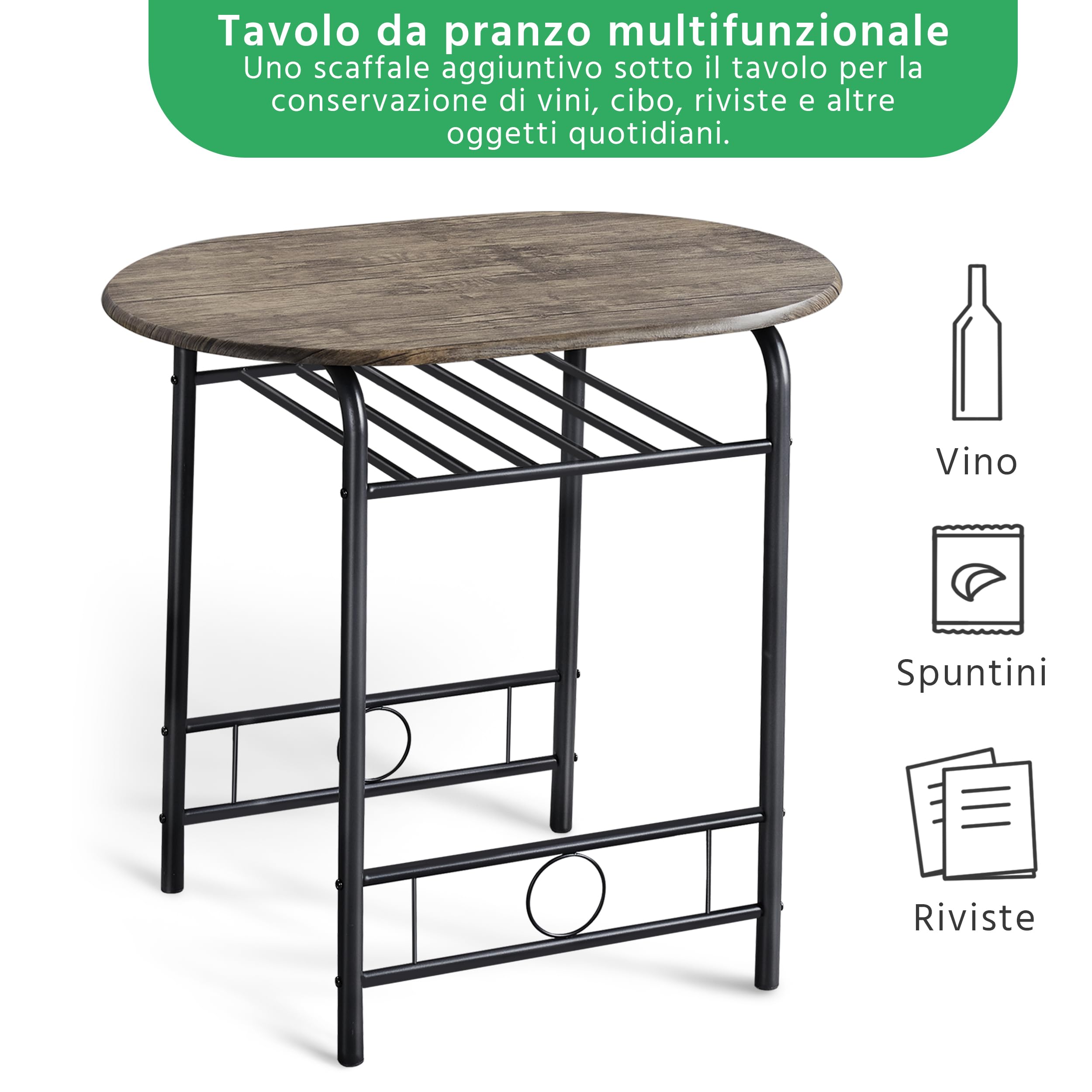 VERSATILE: con un ripiano sotto il piano, questo tavolino per la colazione offre spazio aggiuntivo per bottiglie di vino, tovaglioli e altri oggetti essenziali. Inoltre, puoi rimuovere il ripiano per ottenere uno spazio per le gambe ancora più ampio. La combinazione di colori e le dimensioni compatte rendono questo set perfetto per la cucina, il balcone, la camera da letto, l'appartamento, il dormitorio, l'ufficio, ricevimenti e le feste.