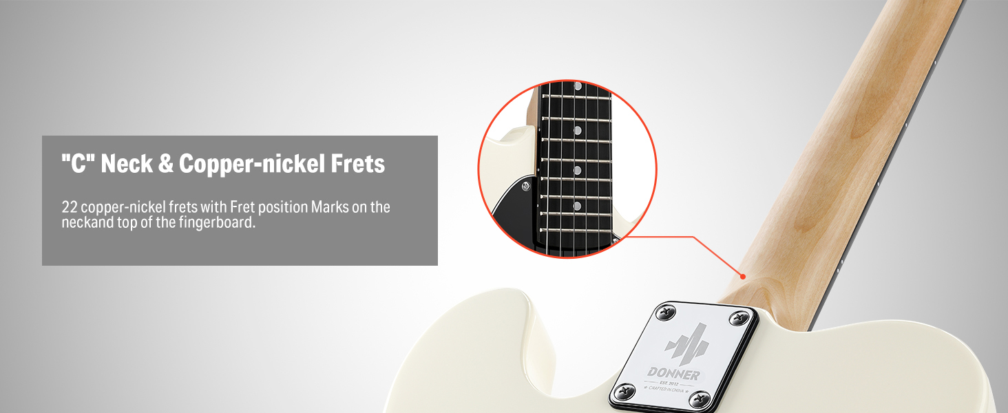 Classic and Comfortable Designs - Donner full-size electric guitar uses the “C” neck profile and has 22 copper-nickel frets. 23 copper-nickel frets with Fret position Marks on the neck and top of the fingerboard. It combines two classic and comfortable designs, also suitable for beginners.