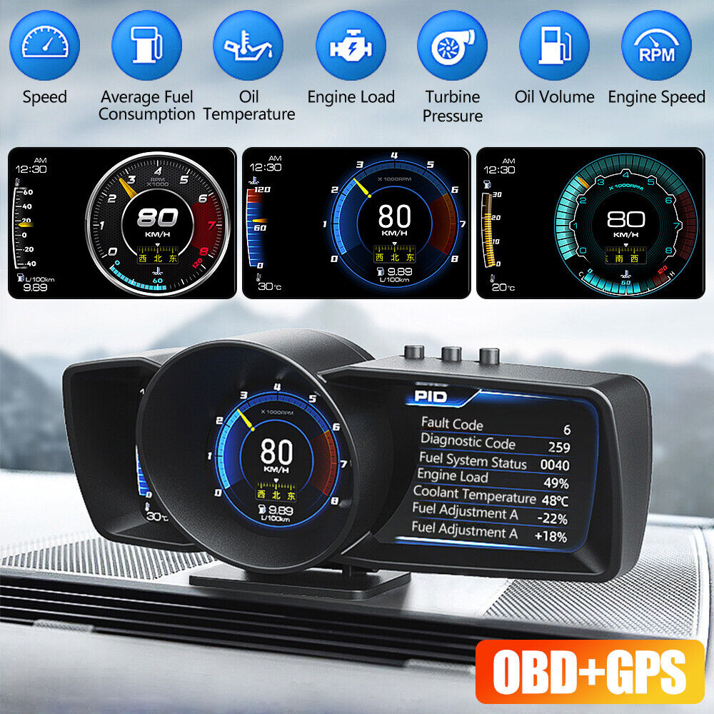 OBD2+GPS Car Gauge HUD Head-Up Digital Display Speedometer Temp Alarm Turbo RPM