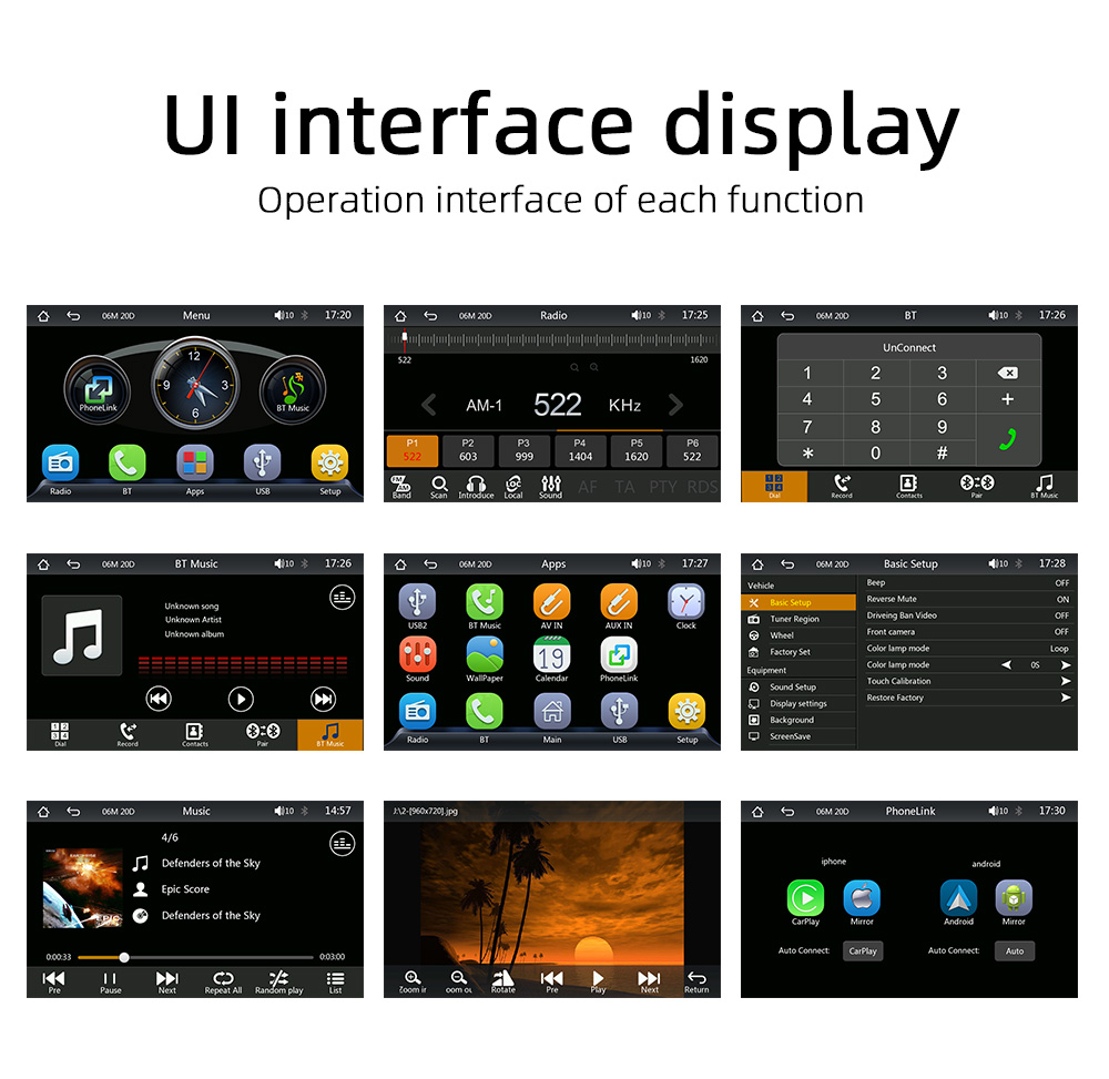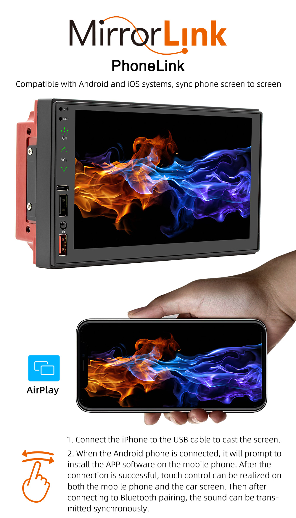 【Phone Mirror Link function】 Mirror Link via the original USB line of the phone can be synchronized with the built-in screen. Through Mirror link, the car radio displays the content of your mobile phone screen synchronously.Turn on the navigation app on your phone, you can use the navigation function in your car while driving.