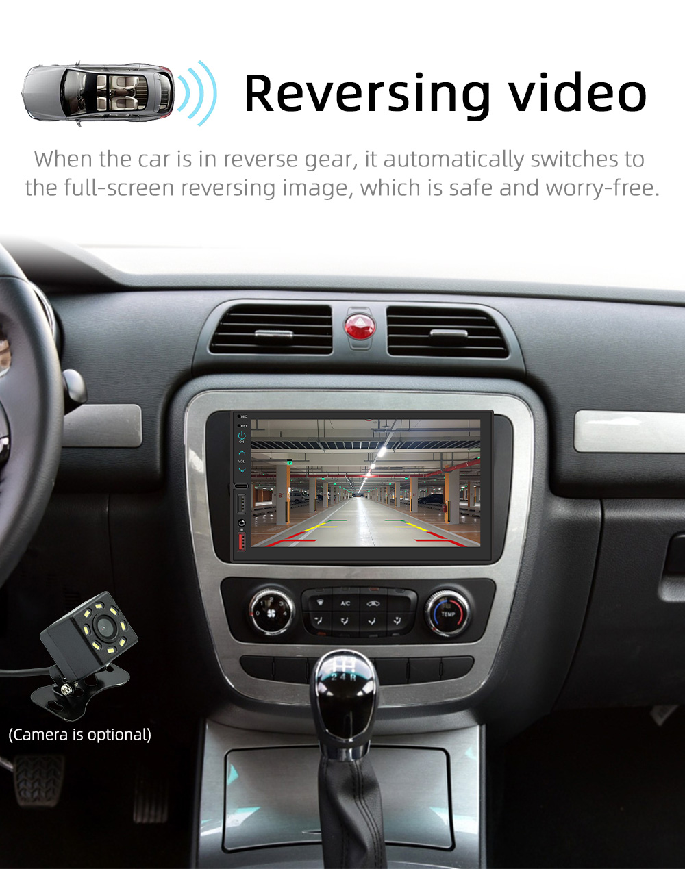【Reversing Image Function】After connected with the rear camera, you can see the image on the radio screen through the rear view camera when reversing your car. The 7-inch touch screen will automatically display the reverse image once you pull in reverse. Make your daily reversing safer.