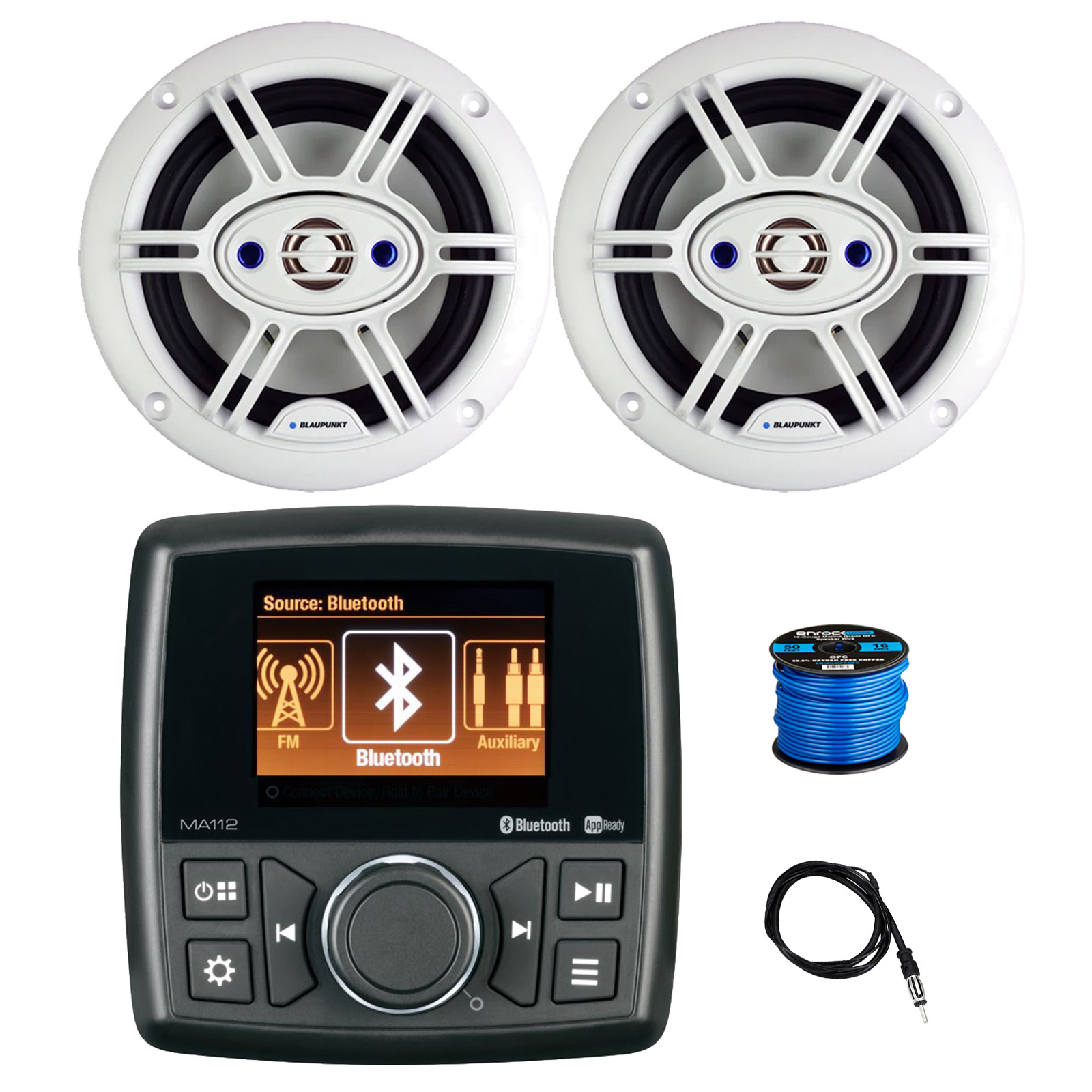 • PACKAGE BUNDLE INCLUDES: Marine Audio MA112 AM/FM Radio Stereo USB Bluetooth Marine Receiver, 2x 6.5" 240 Watt 4-Way Outdoor Speakers (White) w/Wire, Radio Antenna
