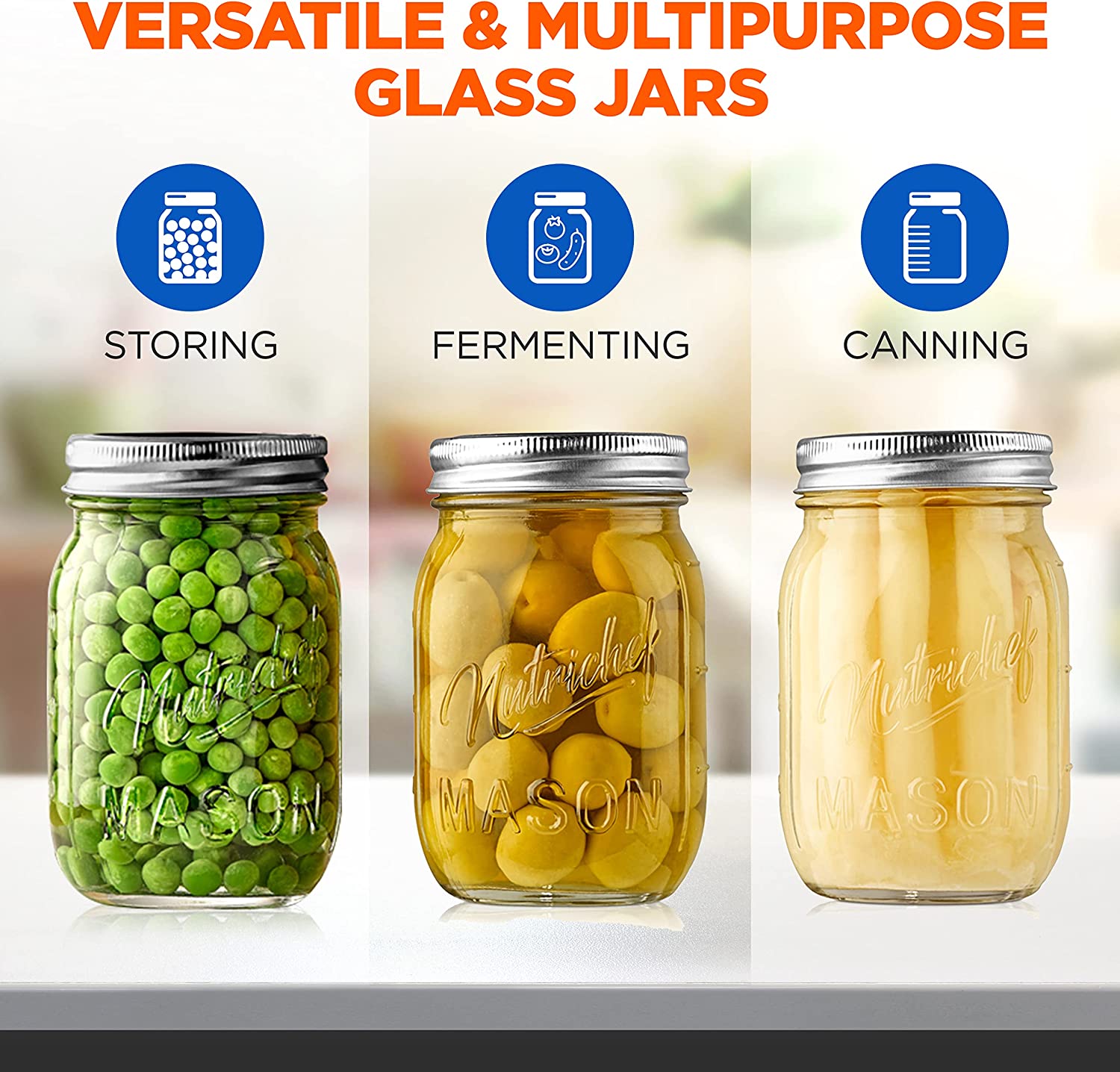 • 6 PCS SET: The mason jar set comes with 6 glass mason jars with regular lids and bands. ideal for meal prep, food storage, jam, honey, wedding favors, shower favors, baby foods, dry food, spices, and more