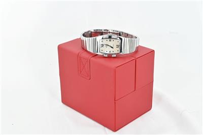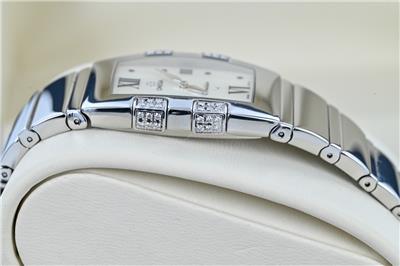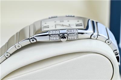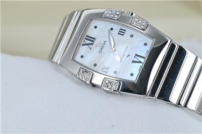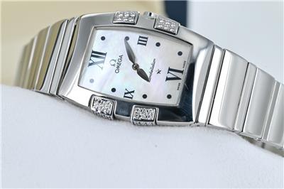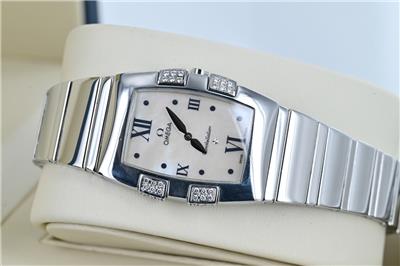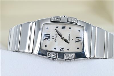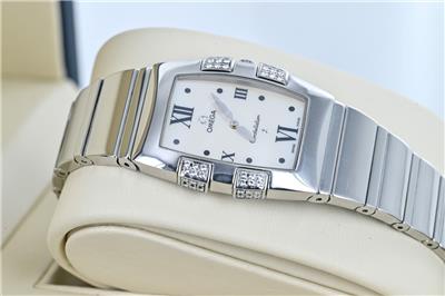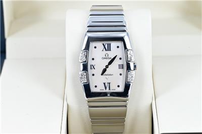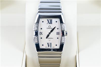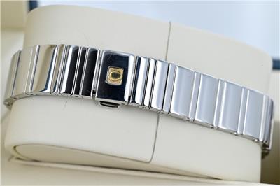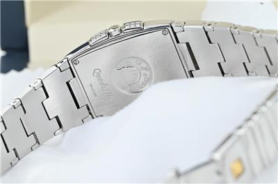 Here we have for sale a genuine ladies Constellation Quadrella wristwatch that is ready to wear. The watch case is stainless steel with a stainless steel caseback which bears the serial number 90402309 and the constellation observatory logo. The watch comes fitted to a stainless steel Omega bracelet that will fit upto a 180mm wrist, there are no spare links supplied. The Stainless steel bracelet is reference 6650/964 and has a polished finish. There are a few marks from daily wear to the case and mostly tothe case back. The watch can be adjusted using the Omega signed crown fitted and is running well, keeping excellent time, having a quartz Omega calibre 1376 movement. The dial and hands are in excellent condition. The watch has a mother of pearl dial and is supplied with an Omega service pouch, but no original box, manuals, or warranty card. The watch measures 25mm in diameter excluding crown and has a diamond set bezel.