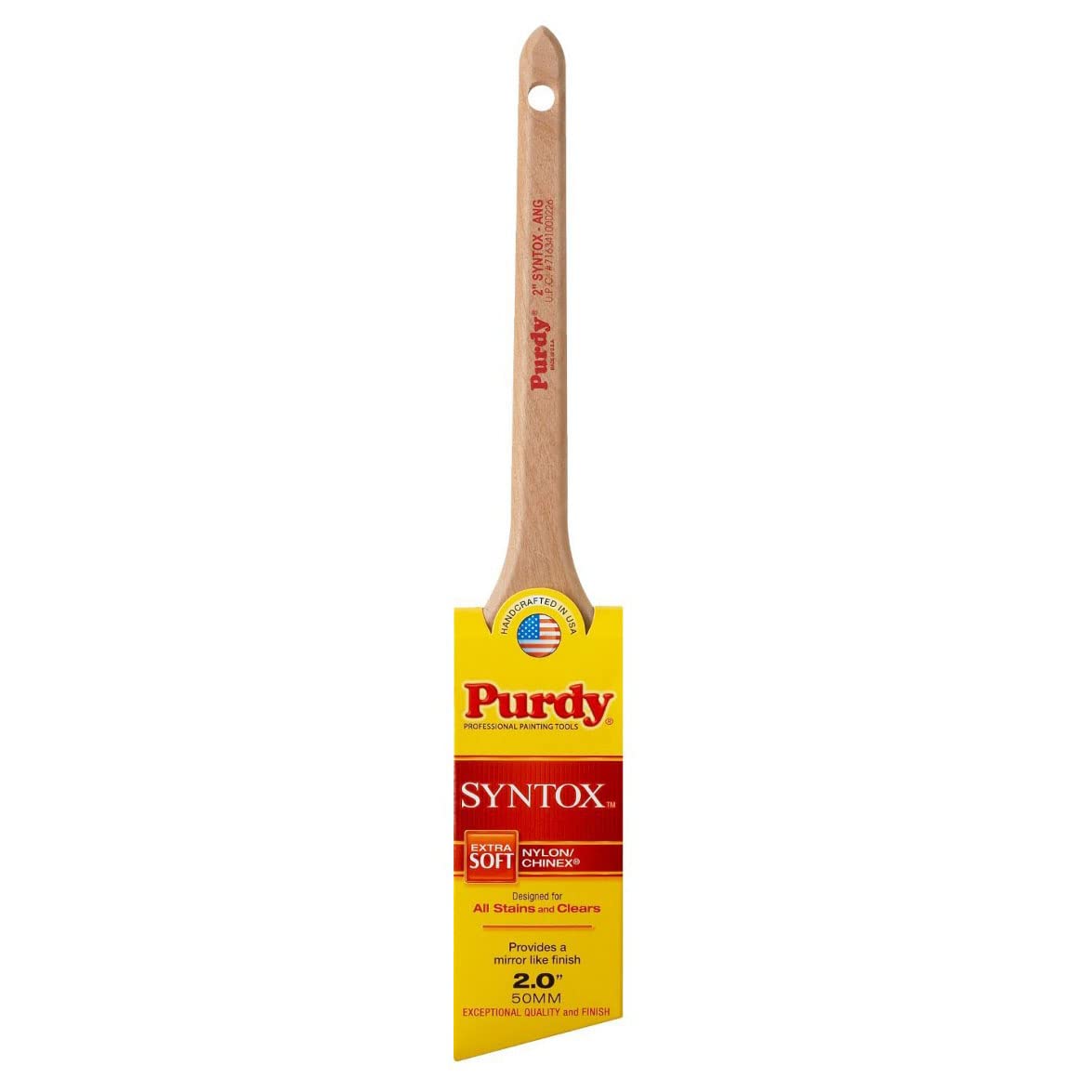 Includes (1) Purdy Syntox Angular 2" Paint Brush 144403620. Purdy Syntox brushes are made with soft, synthetic bristles to provide a mirror-like finish. Designed to be long lasting and durable, these painting tools are designed to work best with latex and oil-based paints, stains, clears, polyurethanes and varnishes. With lightweight and moisture-wicking alderwood handles, these high-quality paintbrushes make every painting job more efficient. Handcrafted in the USA with global materials.
