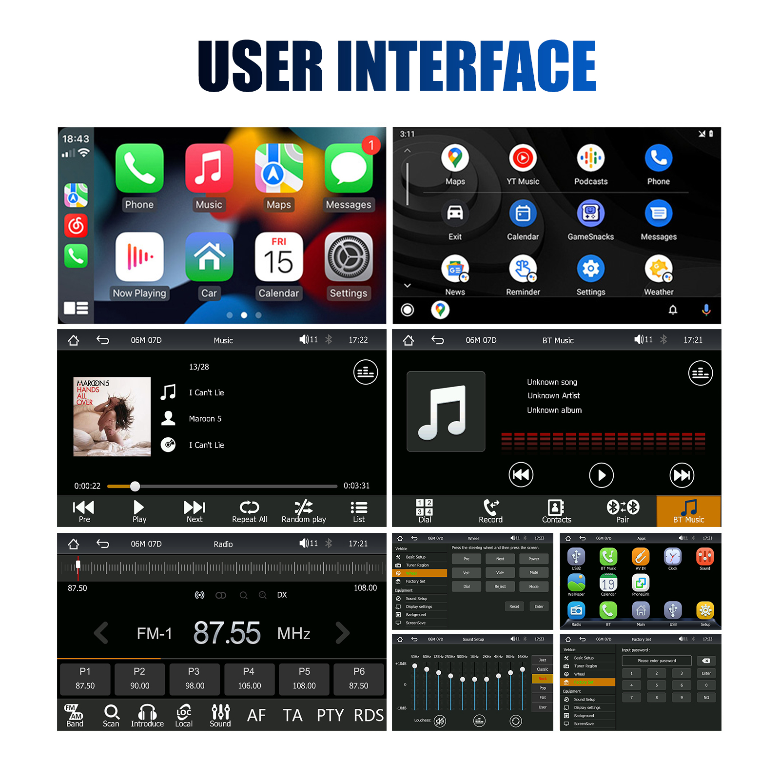 Function support: MP5/reverse/Bluetooth/mobile phone interconnection/wired and wireless carplay/wired and wireless Android auto