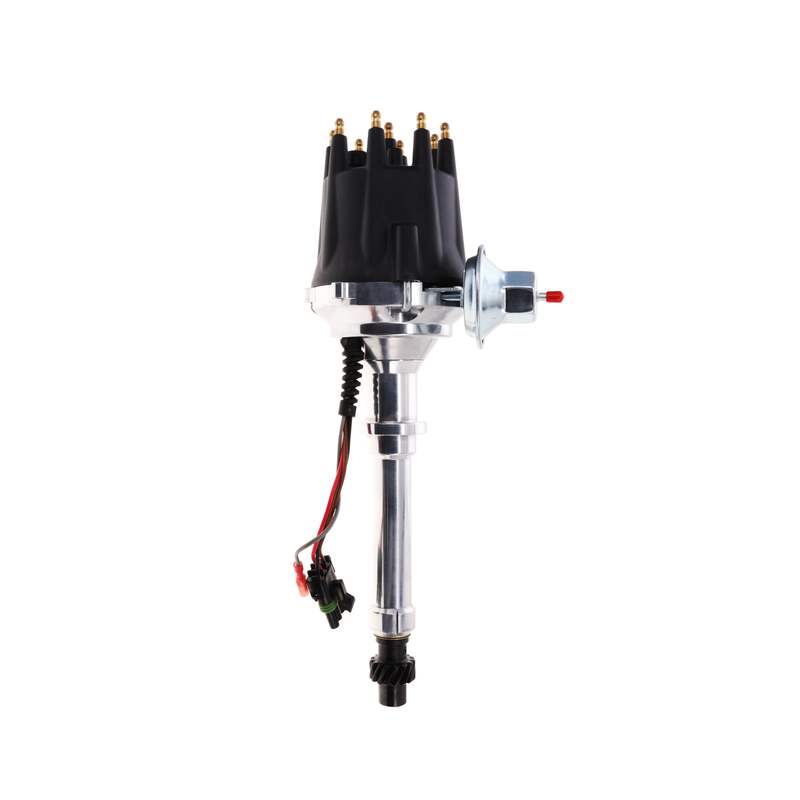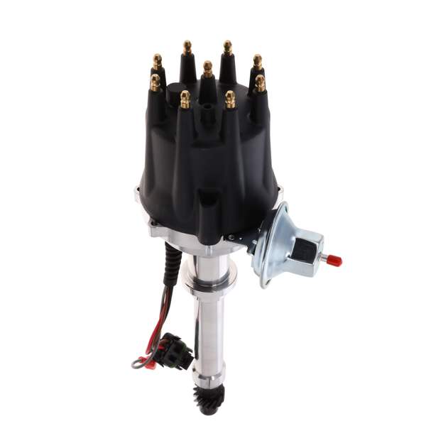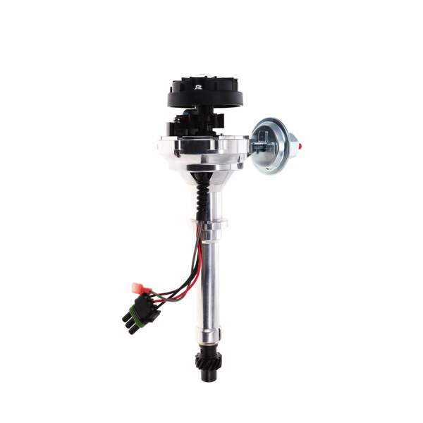 TSP’s Pro Series Ready to Run Distributor is perfect for a street performance ignition upgrade. It features a CNC-machined billet aluminum body and hardened steel shaft, with a sealed ball bearing on top and a sintered steel bushing on the bottom. It also comes with a fully adjustable mechanical advance, vacuum advance, magnetic pickup trigger, and a high-output circuit board module with digital tach output. The dielectric cap comes with solid brass female terminals and a color-matched wire retainer.