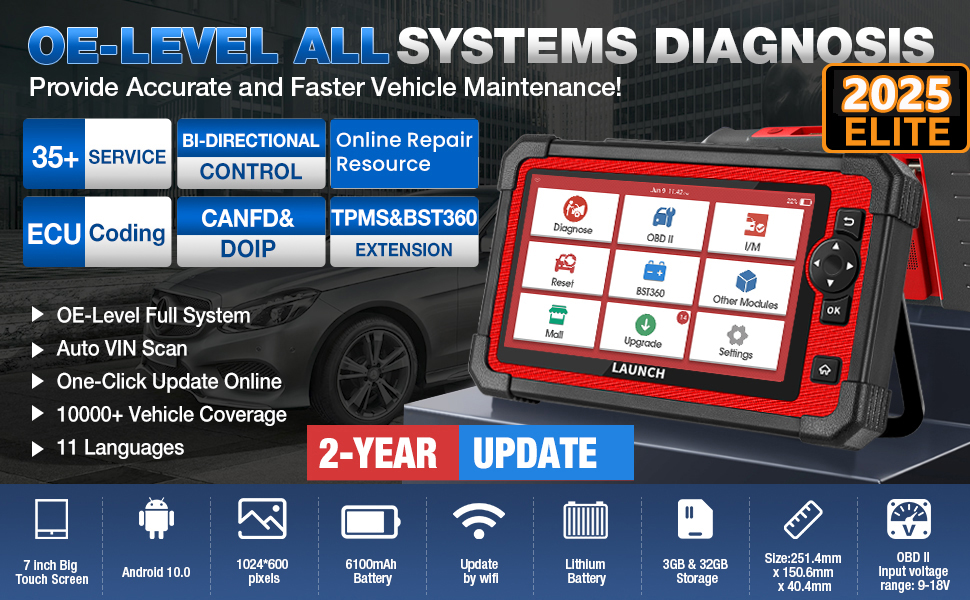 This CRP919E OBD2 Scanner supports All systems Diagnoses, All OBD-II Functions,35+ Reset Functions, Bidirectional Control, CANFD&DOIP, F.C.A Autoauth, ECU Coding, PMI Function(Programmable Module Installation), ECU Configurations, Camera Function,Support TPMS & BST360 Extension Module, Remote Assistance,2 Years Update Included!!! Note: Launch CRP919E is the upgraded version of crp909e/D7/NT809/V6/M*808.And the functions is totally the same with X431 V/PRO 5.0.
