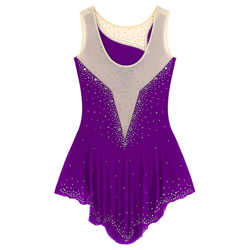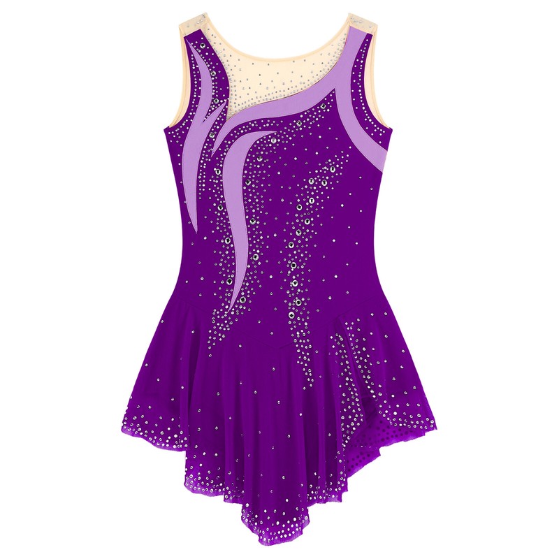 Sleeveless, round neckline dance leotard is decorated with shiny rhinestones, pull on closure.