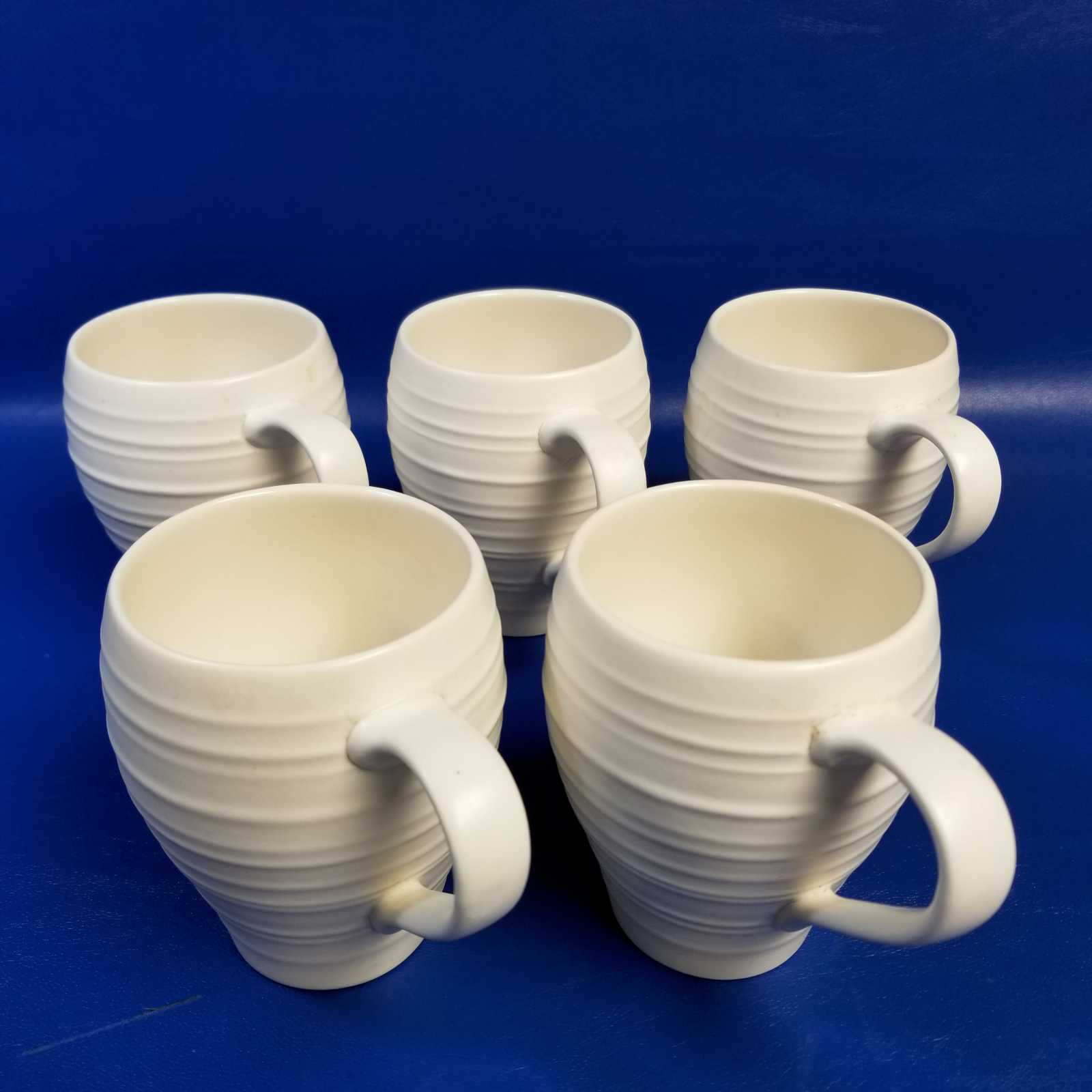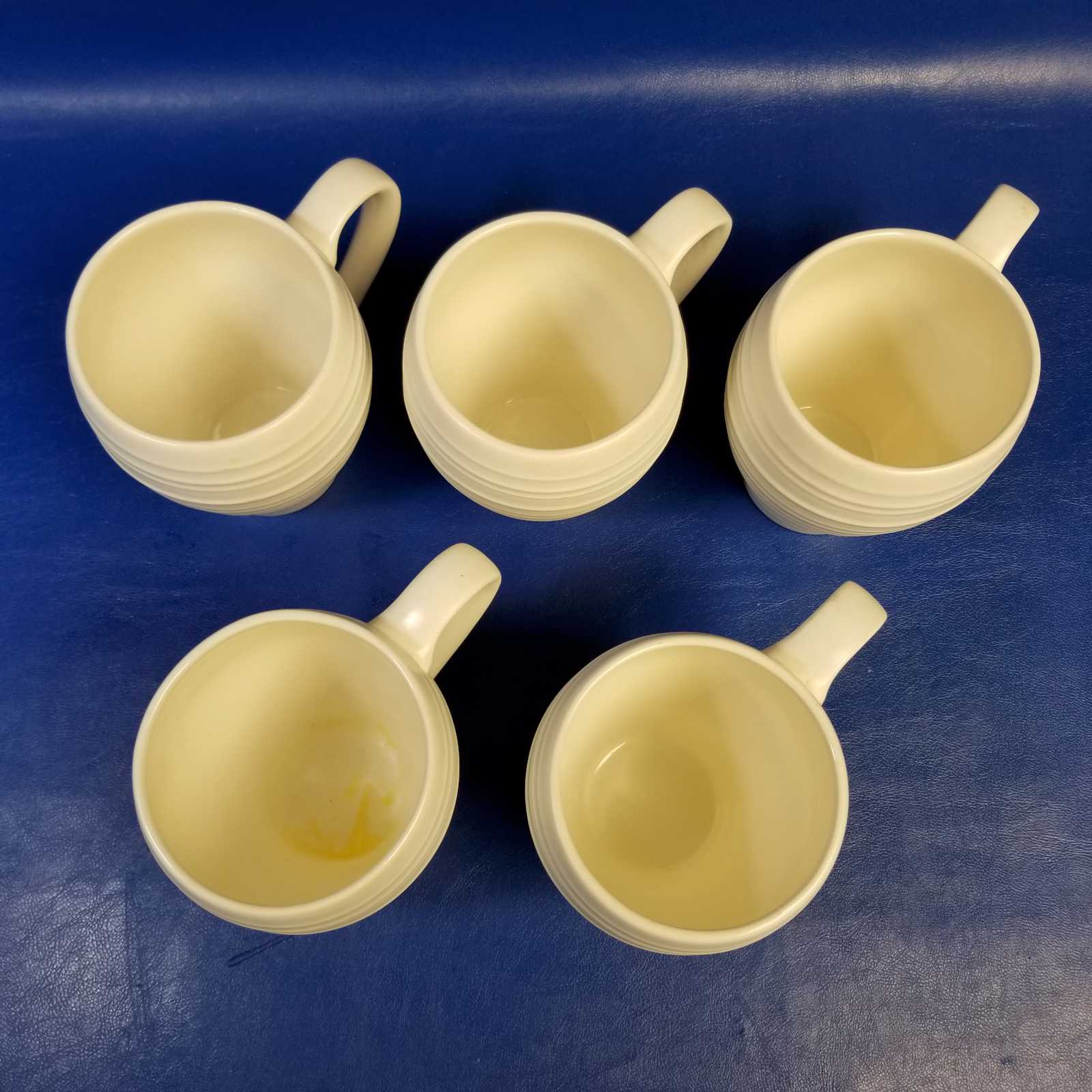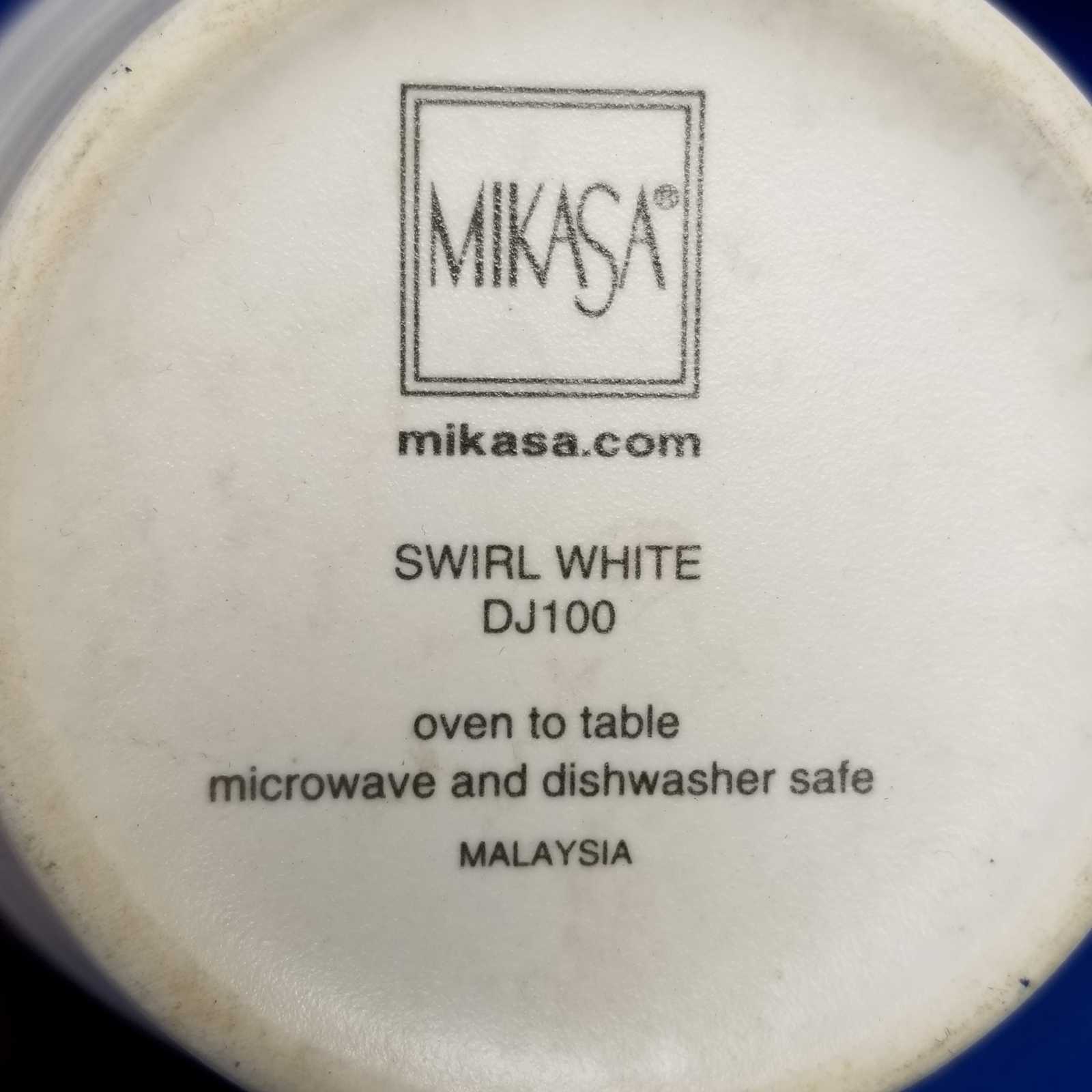 Set includes five Mikasa Swirl White DJ100 mugs, each with a ridged design and 12 oz capacity. Made from durable ceramic, microwave and dishwasher safe for everyday use.
