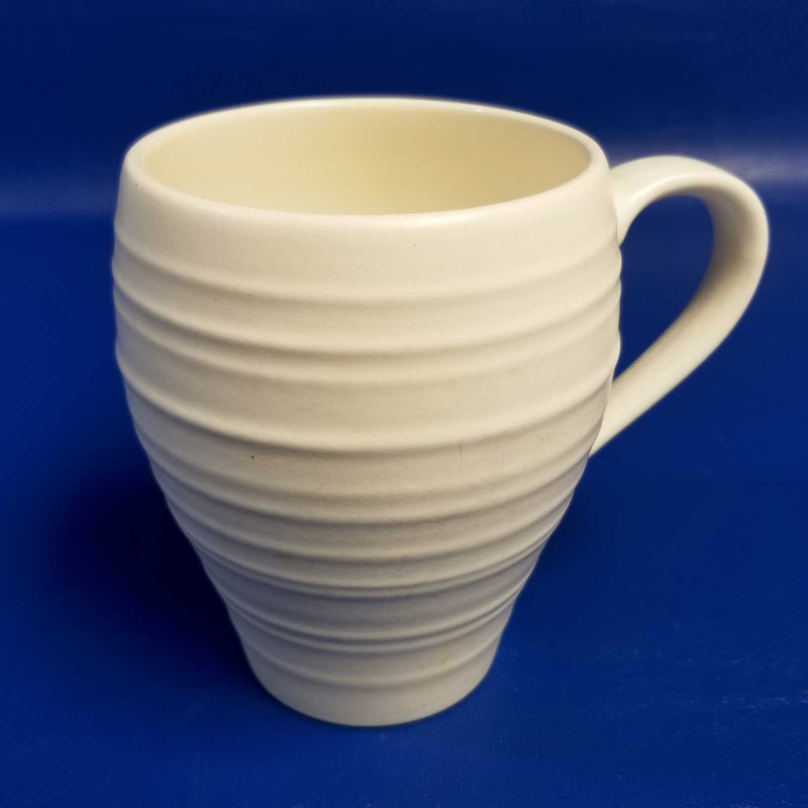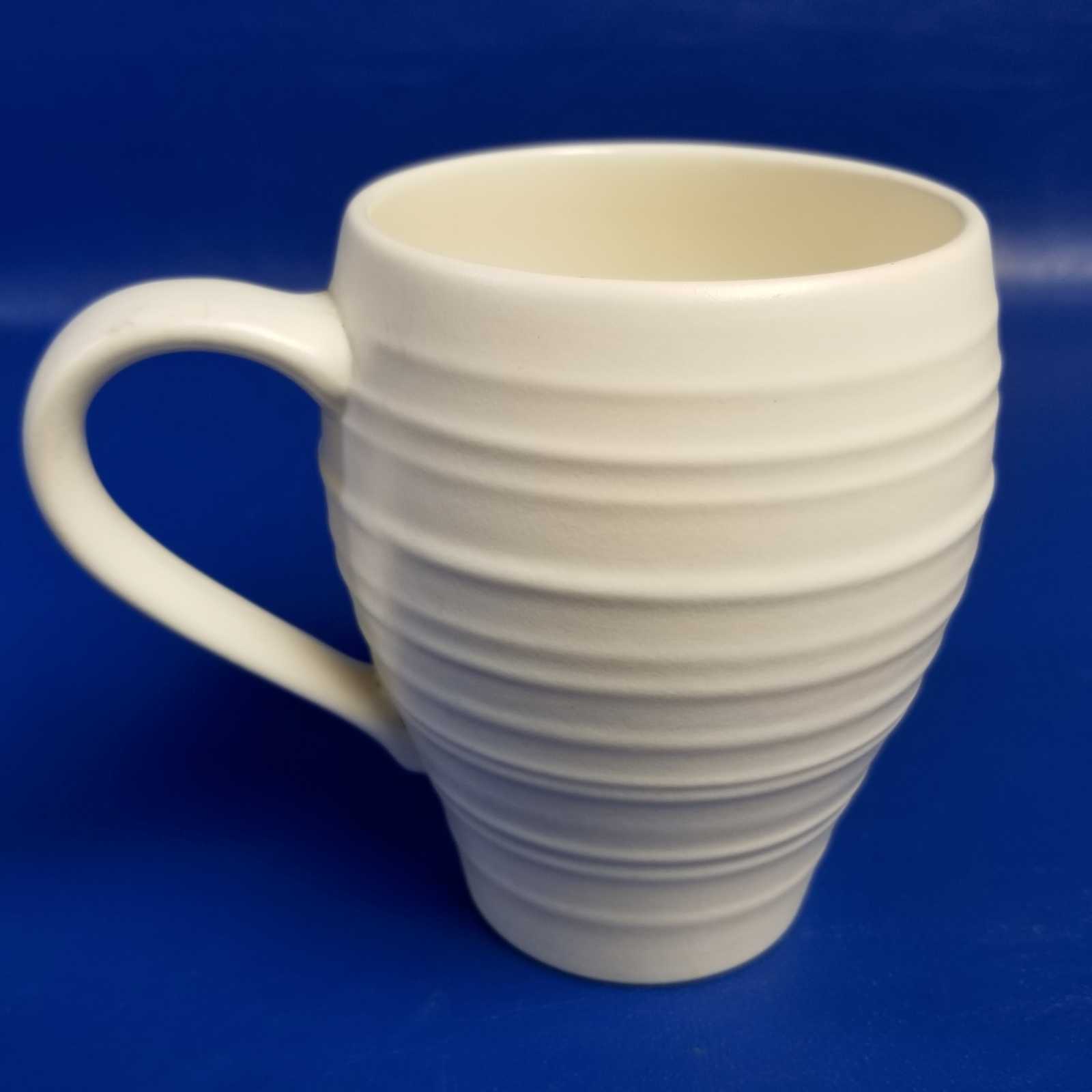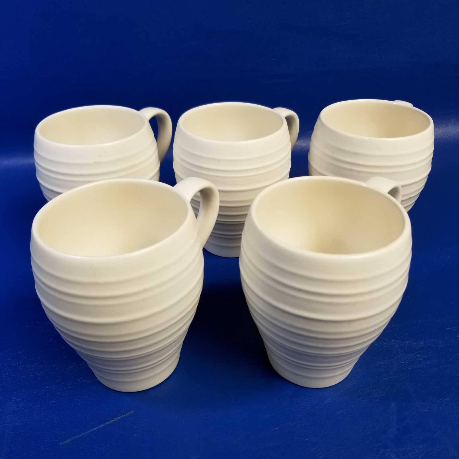 Set includes five Mikasa Swirl White DJ100 mugs, each with a ridged design and 12 oz capacity. Made from durable ceramic, microwave and dishwasher safe for everyday use.