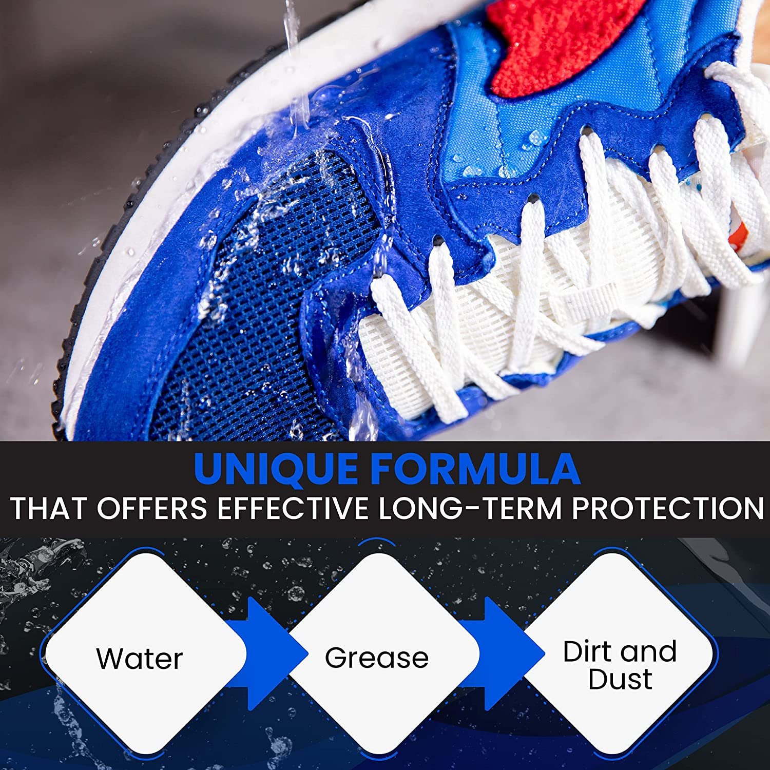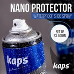 Kaps Nano Protector - Imprägnierungsspray für Schuhe, für Rau- und Glattleder sowie Textilien geeignet, 2 x 400 ml. Das Wildleder Imprägnierspray von Kaps imprägniert und schützt Leder, Textilien und Hightechgewebe wie Sympatex und Gore-Tex zuverlässig vor Nässe und Schmutz. Ihre Lederschuhe und Sneaker erhalten durch die Anwendung einen zuverlässigen und langanhaltenden Wetterschutz. Vorteile des Imprägnierungssprays: Das Imprägnierspray ist wasserabweisend und bietet zuverlässigen Wetterschutz. Das Schutzspray für Schuhe imprägniert Leder und Textilien zum Schutz vor Nässe und Schmutz. Das regelmäßige Imprägnieren erhöht die Lebensdauer des Materials. Spray mit innovativer Technologie.Anwendung:Die Versiegelung für Lederschuhe vor der ersten Anwendung an einer unauffälligen Stelle des Leders testen. Das Schuhe Imprägnierspray gut schütteln, die Schuhpflege ca. 20 cm vom Material entfernt auftragen. Ihre Schuhe gleichmäßig einsprühen, ohne diese dabei zu durchnässen. Schuhe aus Glattleder bei Bedarf abreiben, Rauleder Schuhe bürsten.Hinweis: Kaps Nano Protector nur im Freien oder bei guter Belüftung verwenden. Bitte verwenden Sie das Spray zum Imprägnieren Ihrer Schuhe nicht auf lackiertem Lackleder oder synthetischen Materialien.