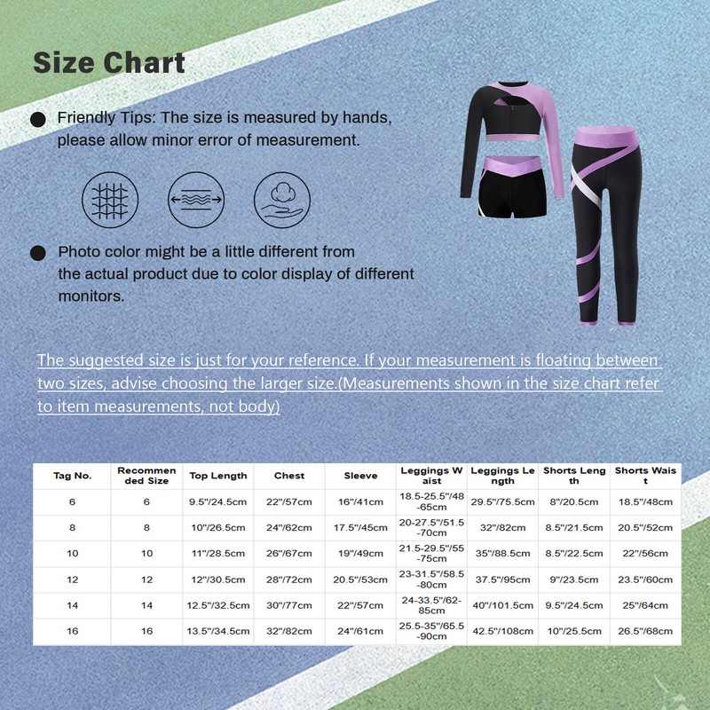 | Tag No. | Recommended Size | Top Length | Chest | Sleeve | Leggings Waist | Leggings Length | Shorts Length | Shorts Waist |