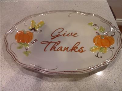 For sale is an oval platter in the Pfaltzgraff "Plymouth" pattern. It measures 12" 1/4 long and 9" wide and says "Give Thanks". It is in mint condition with no chips, cracks, stains or crazing and the pattern is nice and bright. This is a really cute platter.