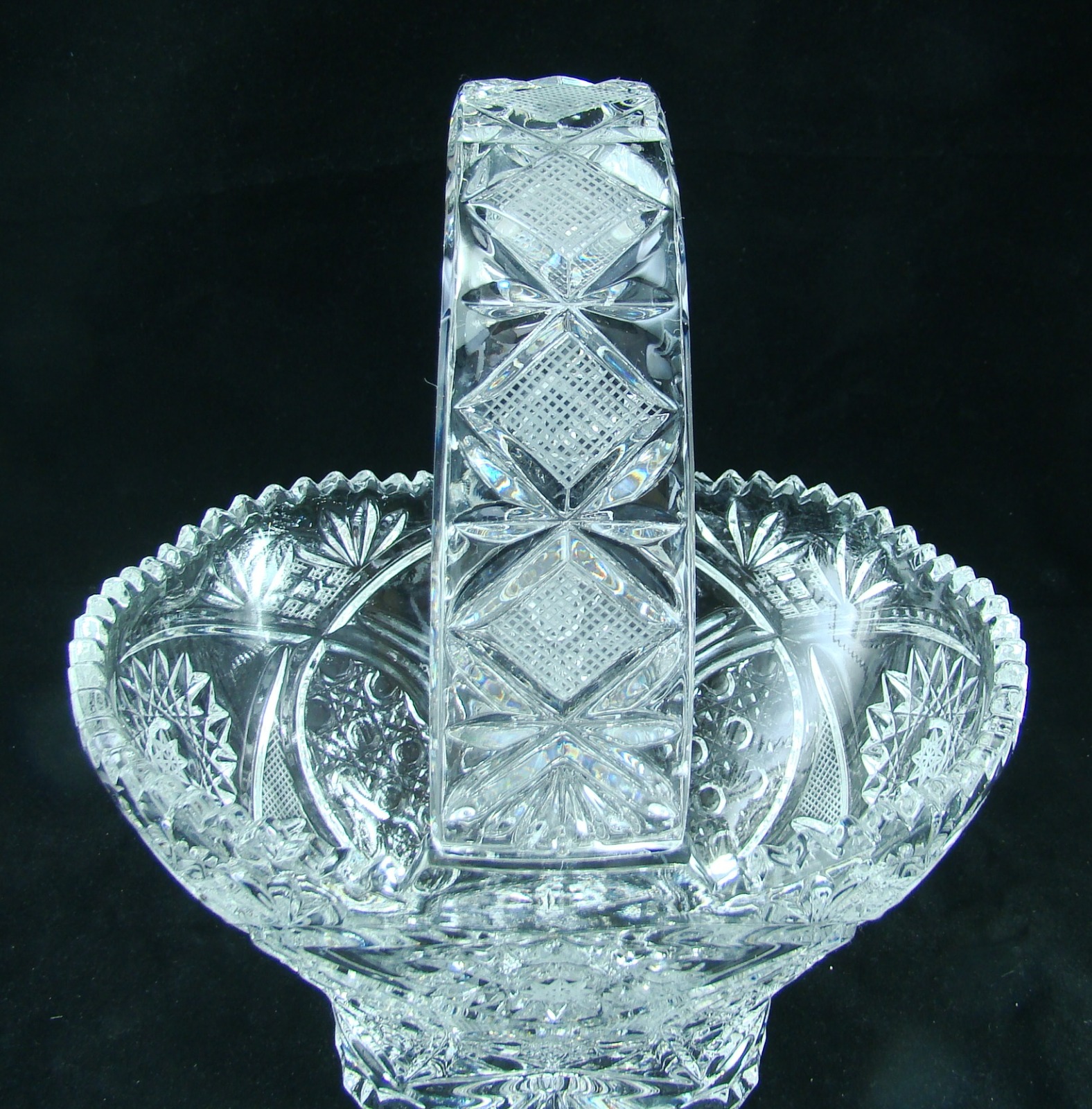 Pressed Glass hand cut details STAR Pattern Handled Basket Vase EXCELLENT