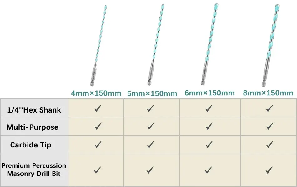 Metric:4mm (length 120mm ), 5mm (length 120mm ), 6mm(length 150mm ), 8mm (length 150mm), 10mm (length 150mm). 5 pieces drill bits meet your different needs.