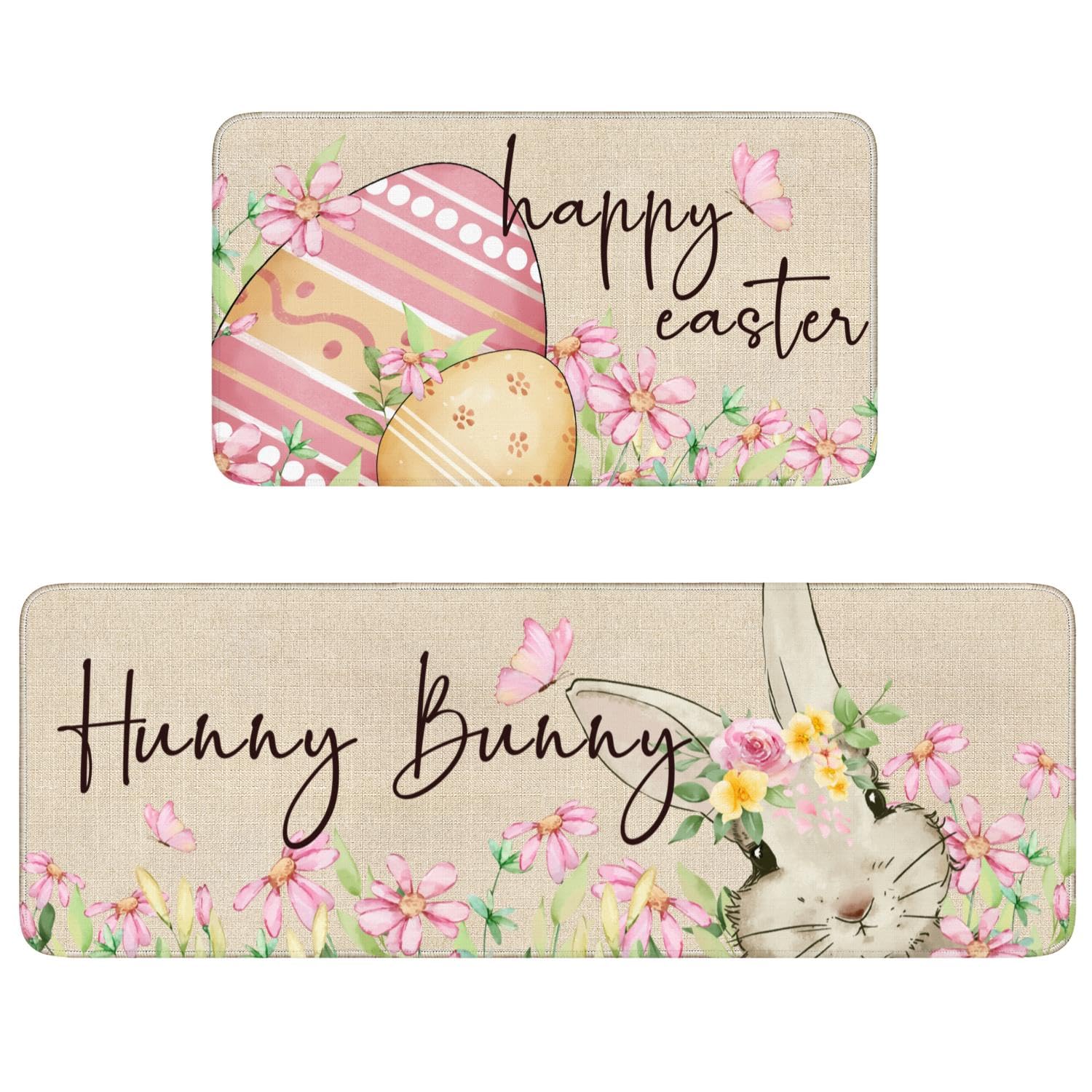 Happy Easter Kitchen Rugs and Mats Set of 2,Spring Bunny Eggs Flowers Floral Kitchen Mat,Rabbit Non Slip Washable Kitchen Floor Sink Mats Decorations for Home Kitchen 18"x48"+18"x30"