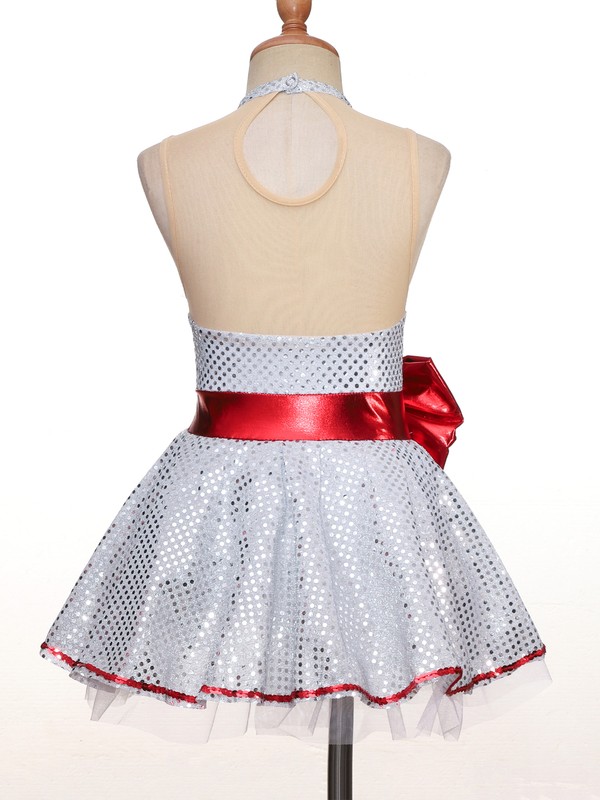 Kids Girls Round Neck Sleeveless Mesh Bowknot Sequins Adorned Dance Leotard Dress.