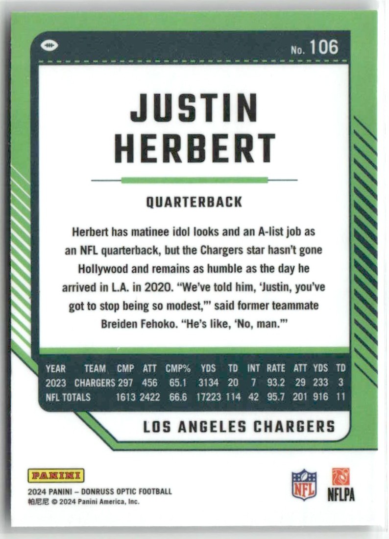 | Justin Herbert 2024 Donruss Optic Los Angeles Chargers #106 | ||||||||||||||||