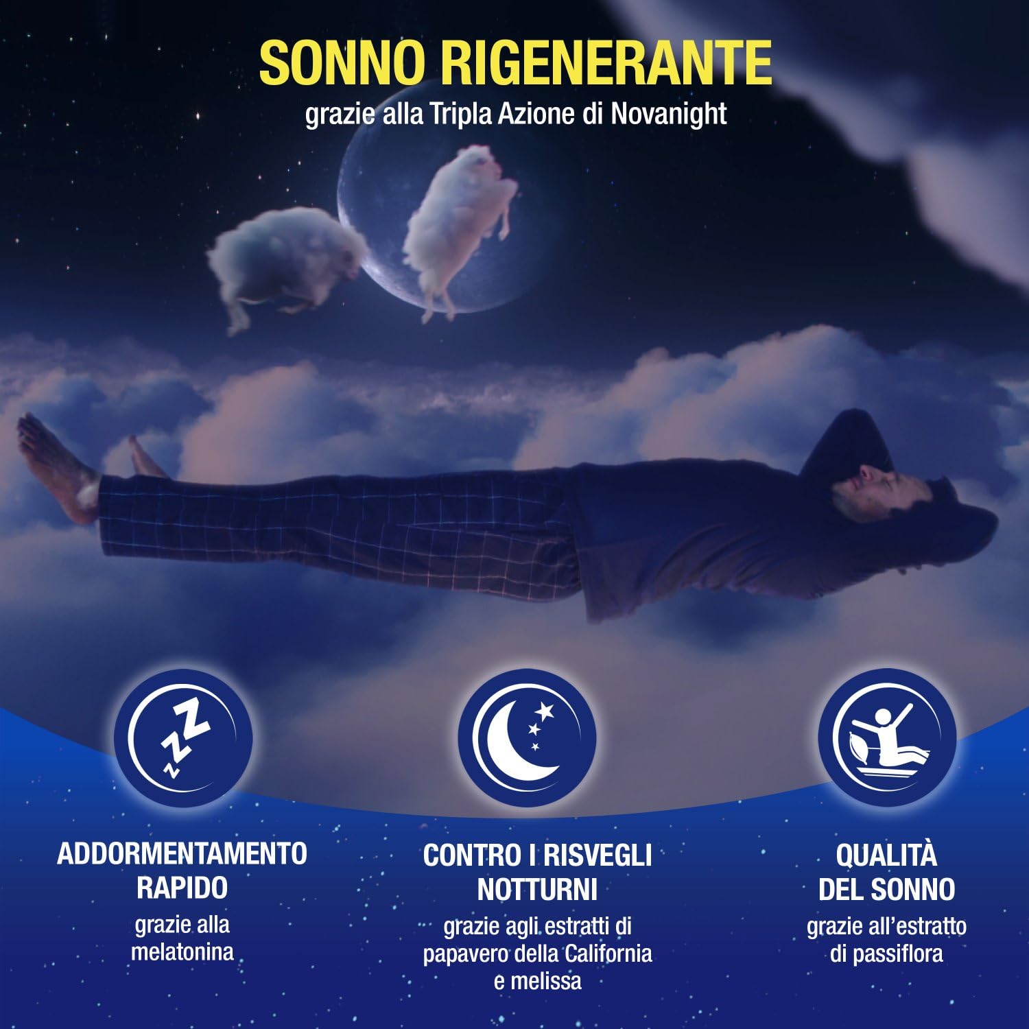 Novanight Tripla Azione Sonno Rigenerante è un integratore alimentare per adulti a base di melatonina ed estratti 100% di origine naturale. Aiuta a ritrovare il naturale ciclo del sonno