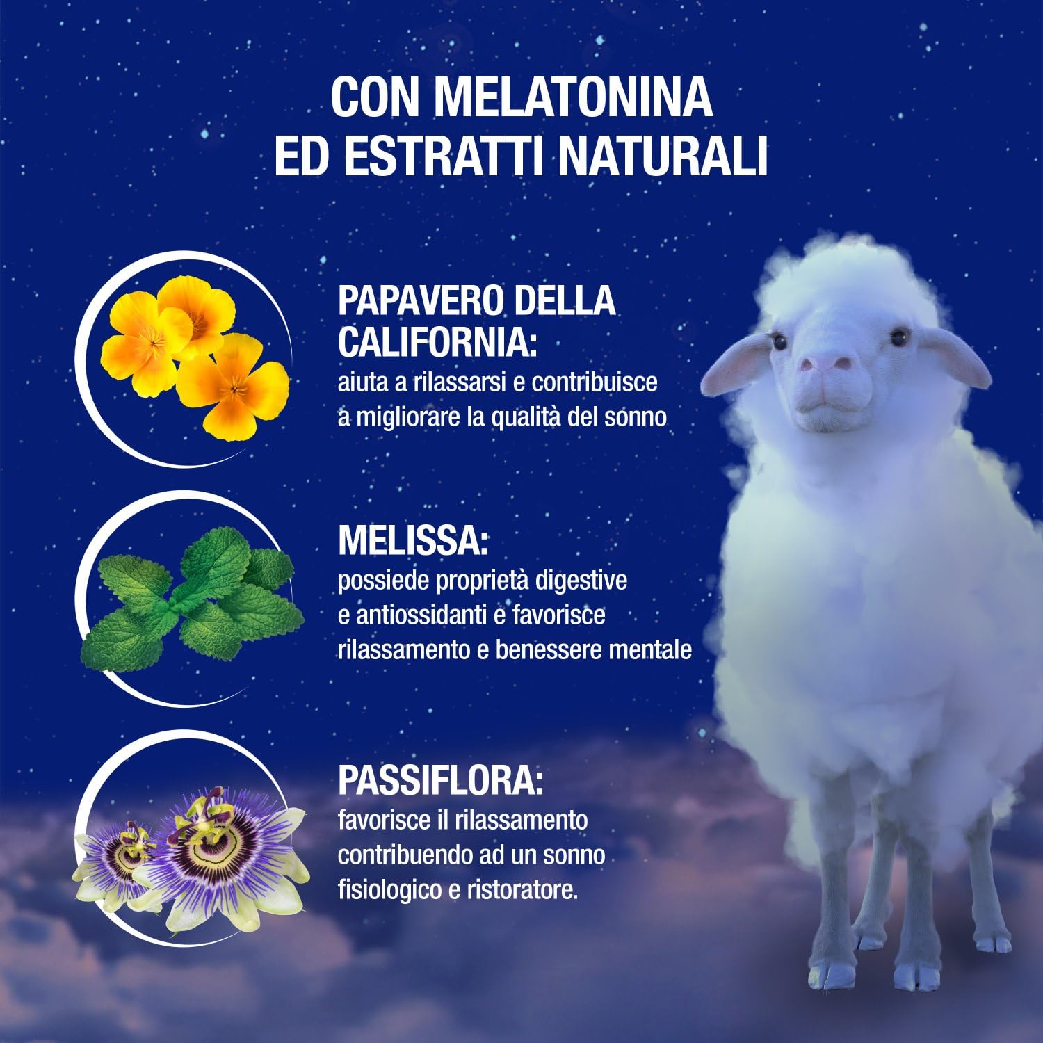 Agisce sulle 3 fasi del sonno per: addormentamento rapido (melatonina); riduzione risvegli notturni (escolzia, o papavero della California, e melissa); migliore qualità del sonno (passiflora)