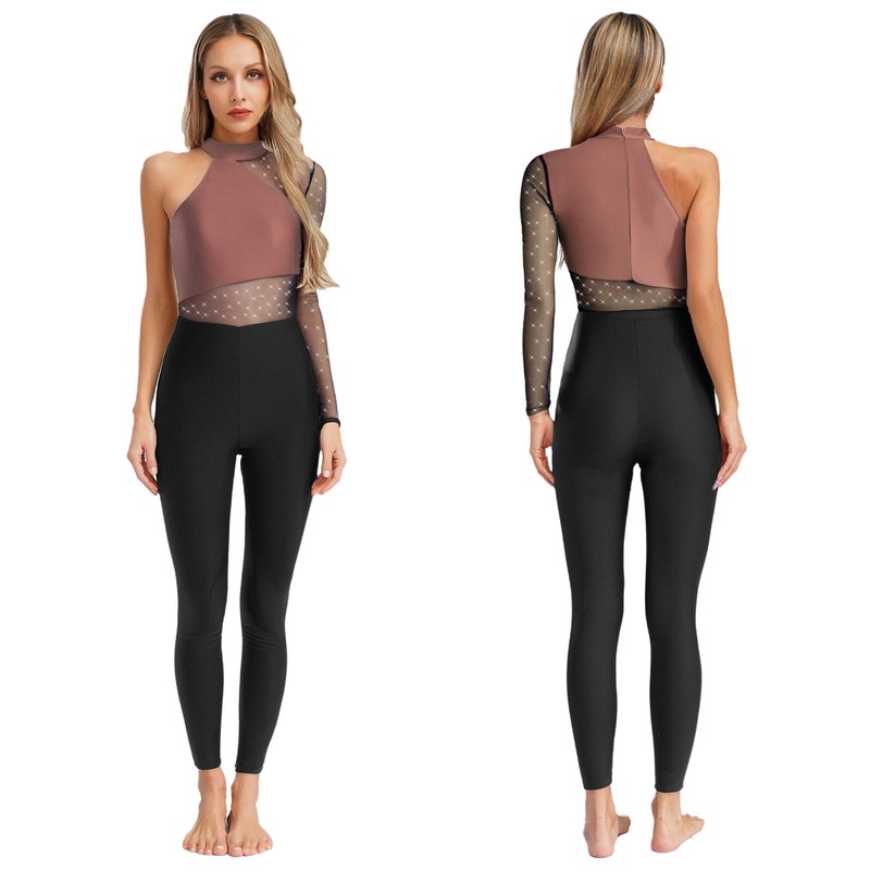 Women’s long sleeve jumpsuit with one shoulder design, and back invisible zipper for easy wearing and taking off.