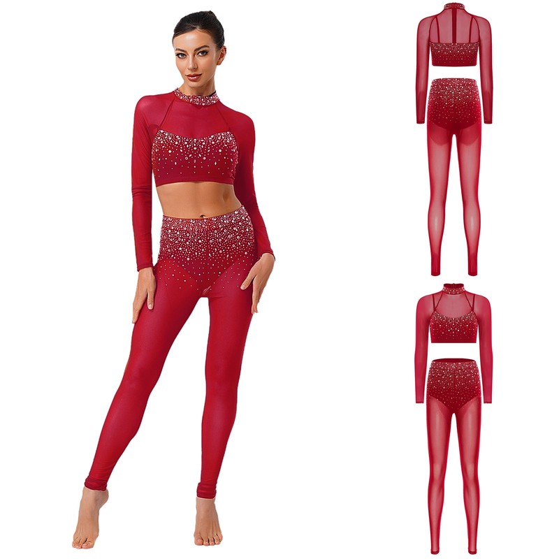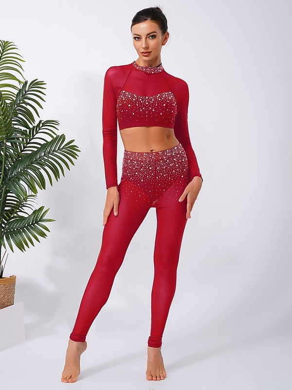 Glittery rhinestones adorn the outfit, bringing a glamorous and fashionable element that is popular in today’s dance and fitness fashion.