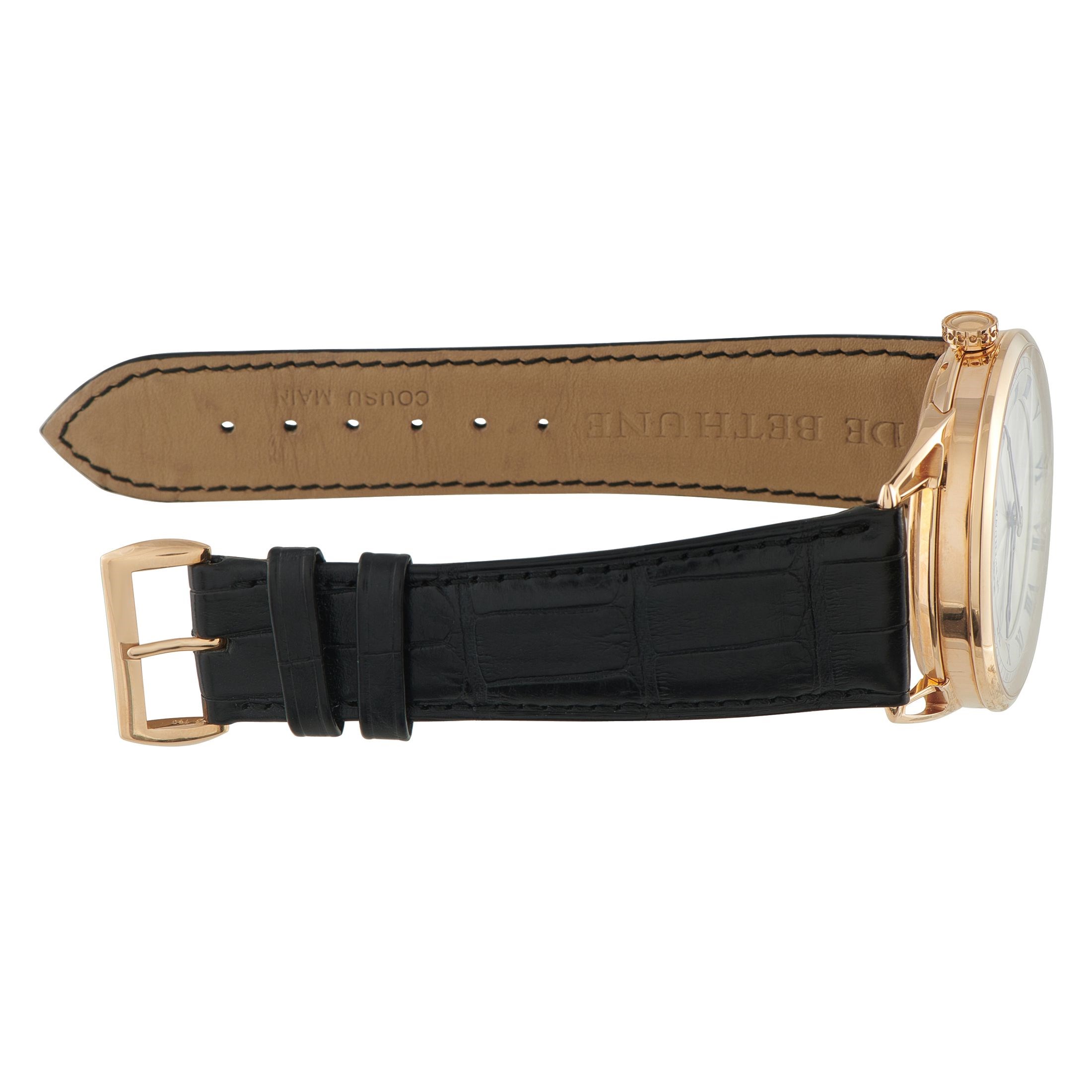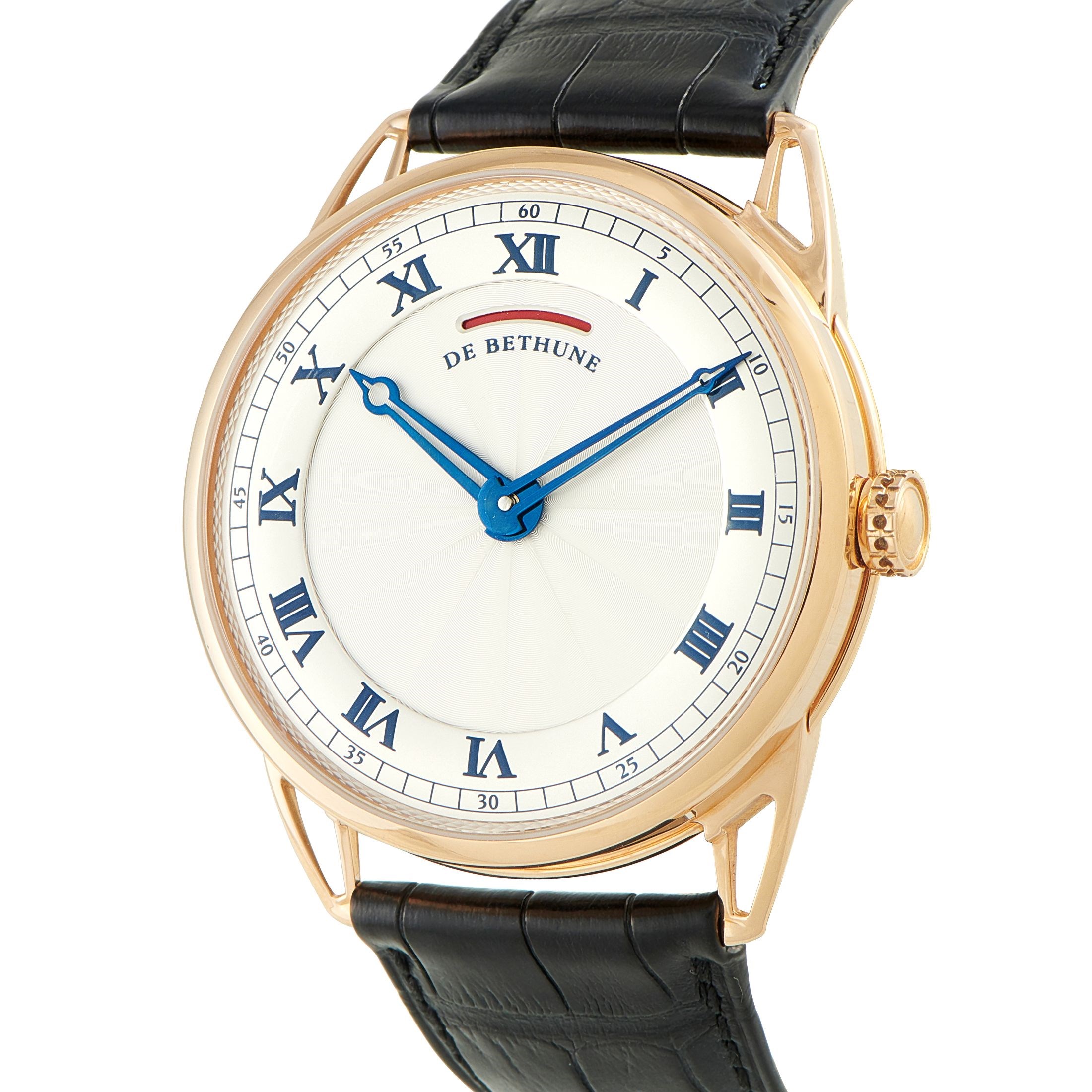 De Bethune's DB25 Reserve de Marche maintains an air of elegant tradition with its hand-guillochd silver dial with a radiating soleil pattern and classic Roman numerals. The flame-blue skeletonized hands, which perfectly match the elegant blue minute track, indicate time in a mesmerizing way. Powering this refined timepiece is the in-house automatic Caliber DB2024, whose blued titanium bridges and parts are visible through the sapphire caseback. The twin-barrel system of this advanced movement provides an impressive six-day power reserve.Offered unworn, this De Bethune DB25 Reserve de Marche 18K Rose Gold Watch db25RS1 comes with a gift box.