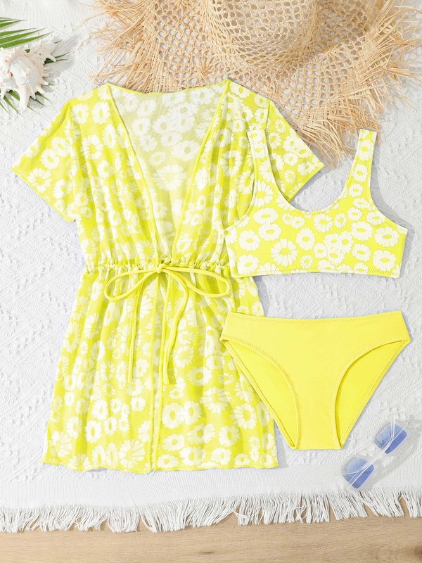 Set Include: 1Pc Girls Tankini Top, 1Pc Swim Bottoms, 1Pc Kimono Coverup