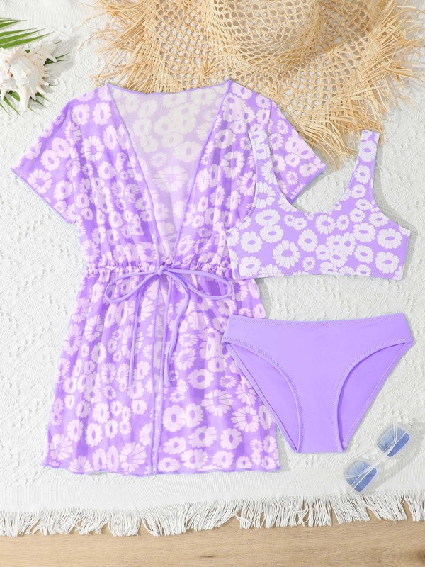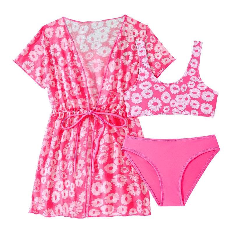 Tankini swimsuit with kimono coverup beach dress for girls, vibrant flower print makes girl beautiful and fashionable.