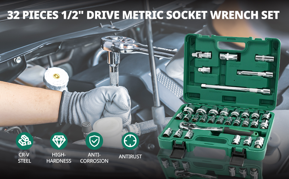 - 【32PCS SOCKET SET】 This 32-socket 1/2" drive set includes - 19pcs 6-point sockets(8-32mm), 6pcs 12-point sockets(10-19mm), 2pcs spark plug socket (16mm 21mm), 1pcs ratchet wrench, 1pc socket adapter(3/8"F to 1/2"M), 2pcs extension bar(5" 10"), 1pc universal joint. Providing you with a wide range of socket sizes to tackle any task.