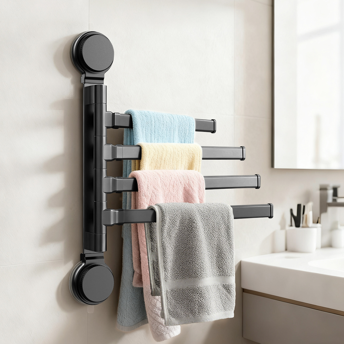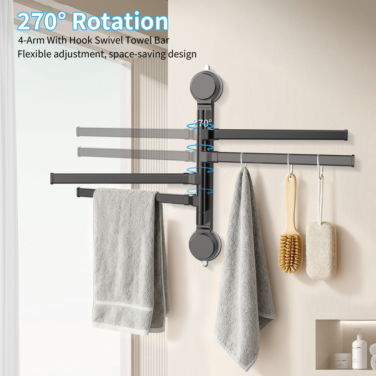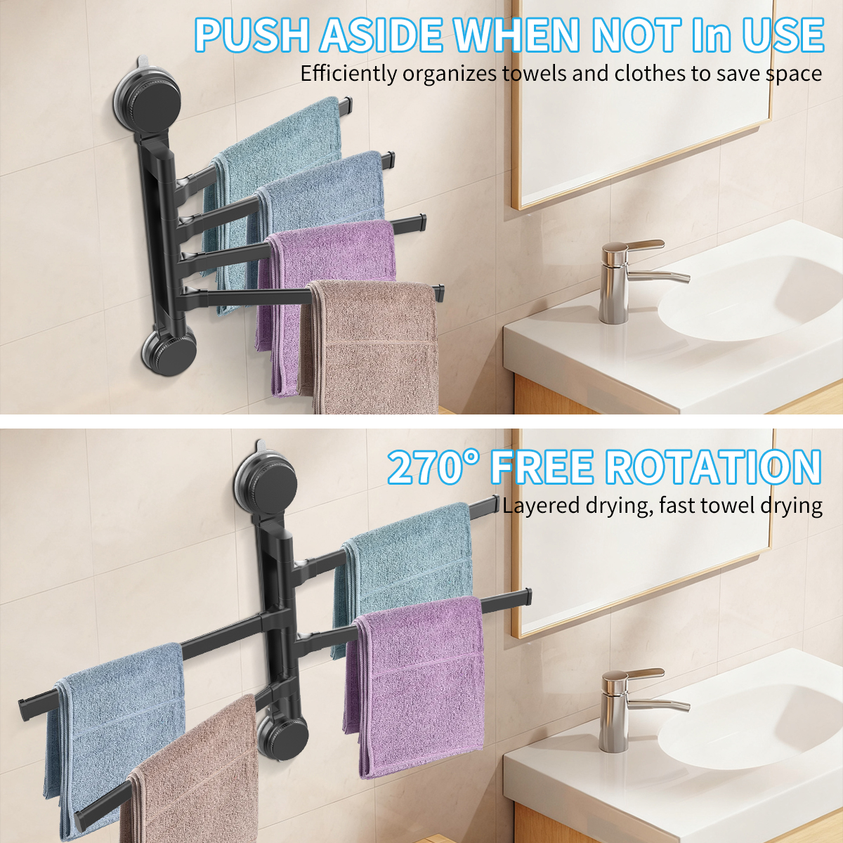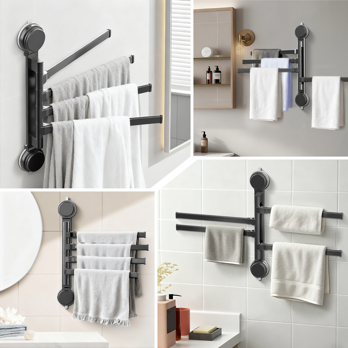 【Practical and Space Saving】4-Bar Swivel Towel Rack; Product Size:12.6" x 13.39'';.The 270° Swivel Towel Rack can be swiveled open and closed for practical convenience and space saving.